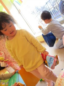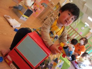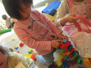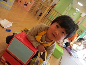手作りの乗り物玩具や他のお友達もレゴ使って、夕方の合同保育の時間も楽しく過ごしております♪