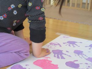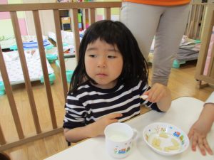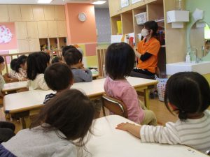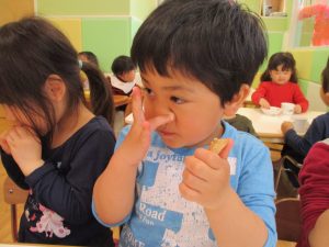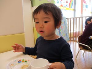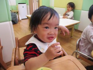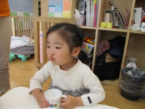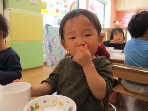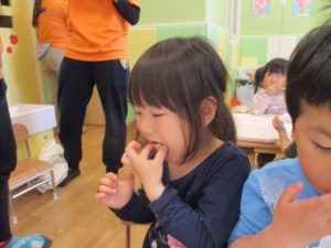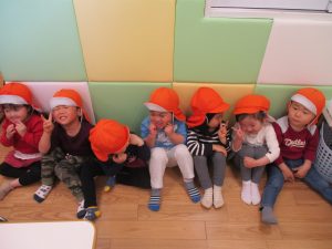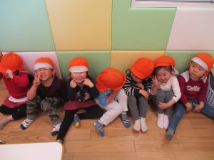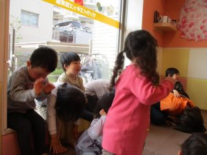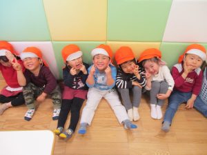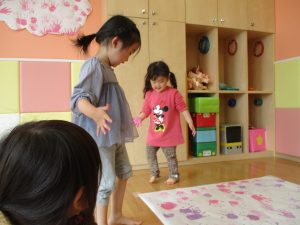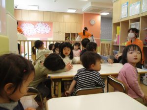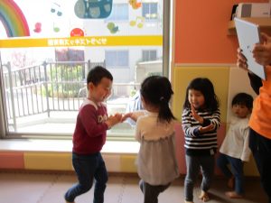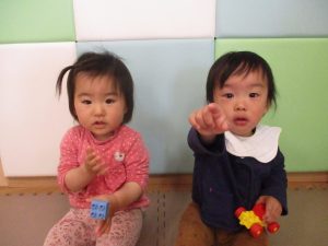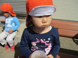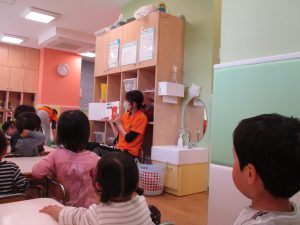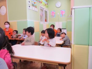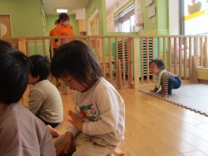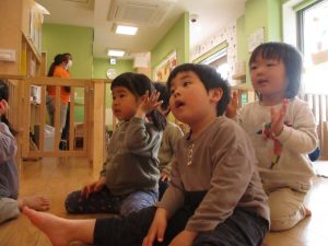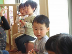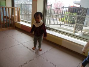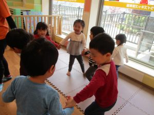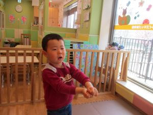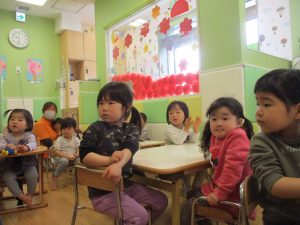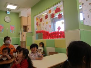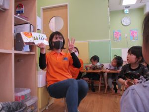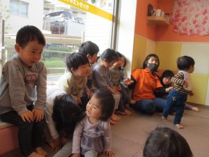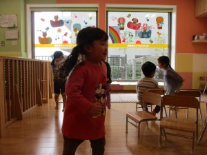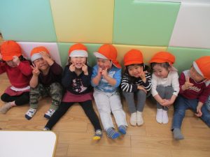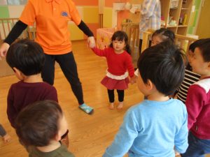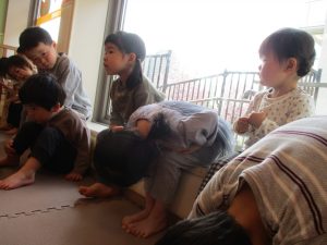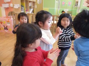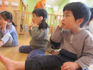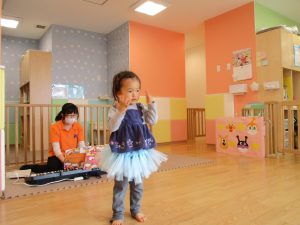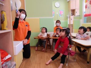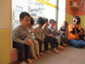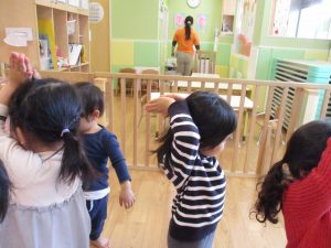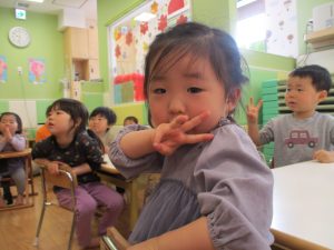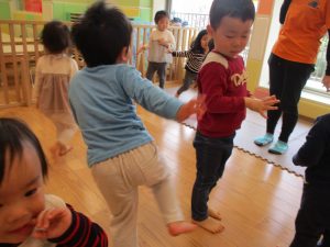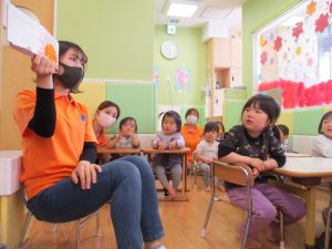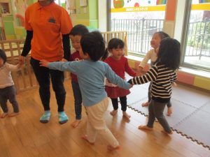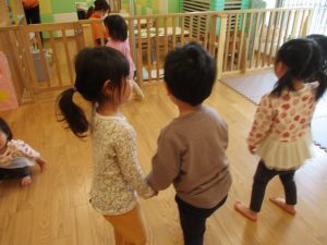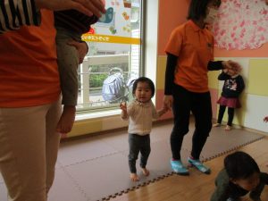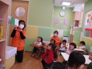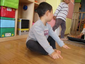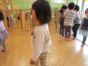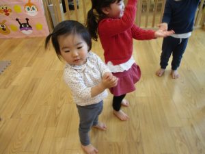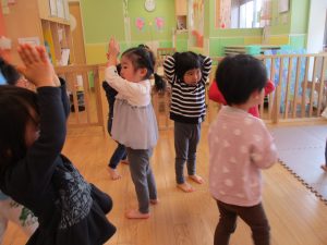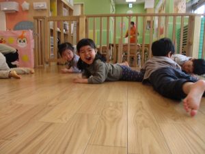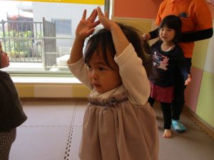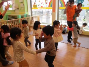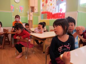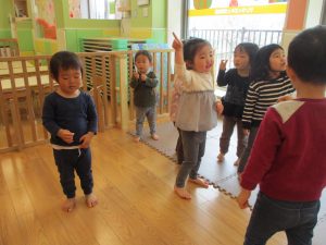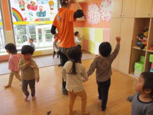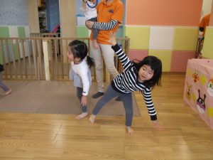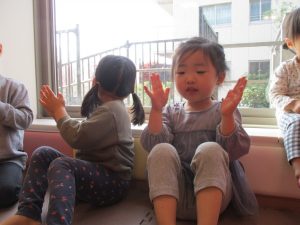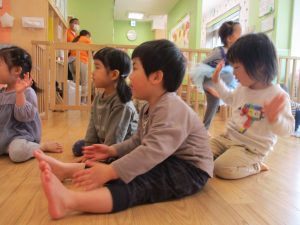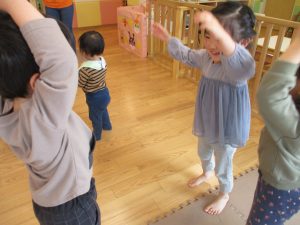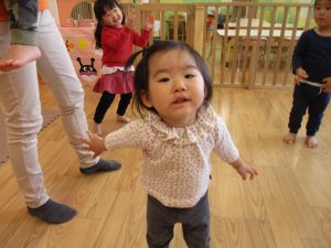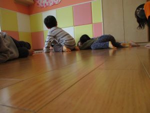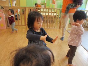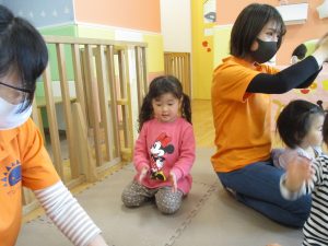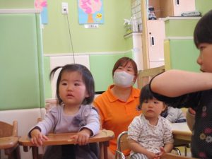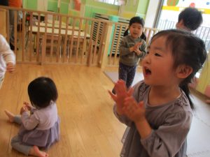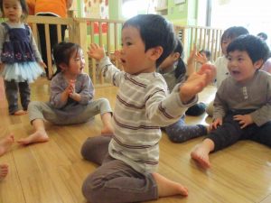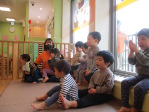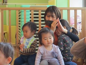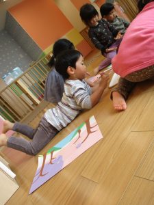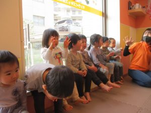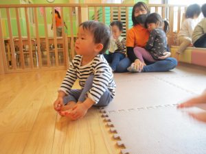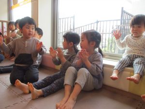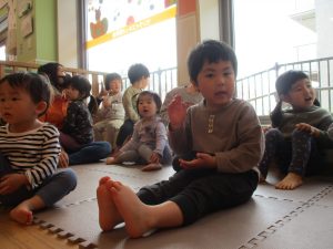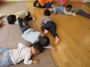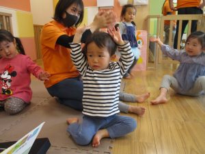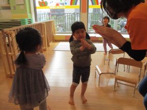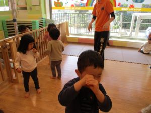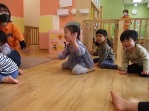 手を叩きましょうや森のくまさんも行いましたが「くまさんだぁ!」との先生の合図でバタッと倒れる仕草がとても可愛いです。