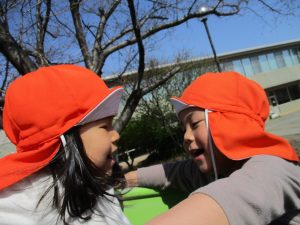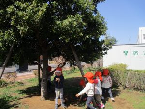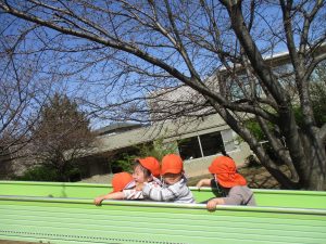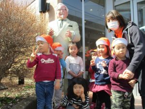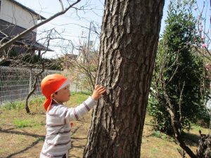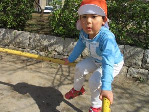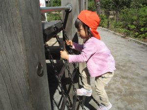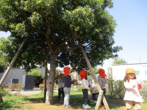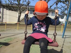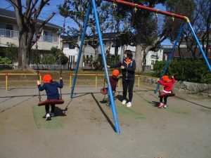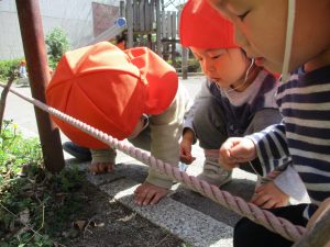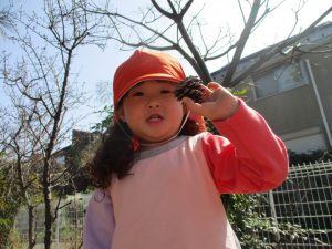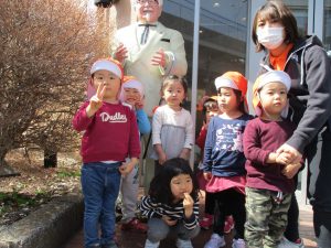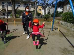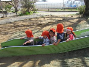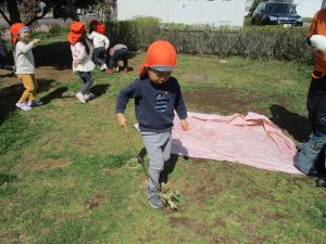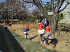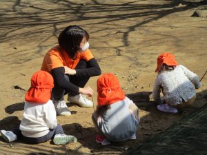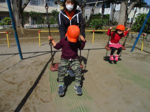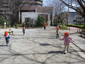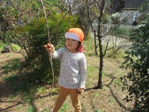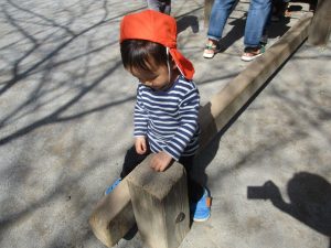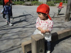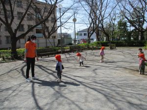 その後はさくら公園まで移動し固定遊具で体を動かしたり、先生が木の棒で描いた線に沿って電車ごっこを楽しんでいました♪
