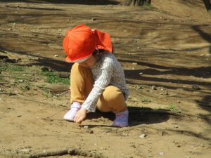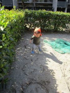 砂場周りに木の棒で線路を描くと「ガタン!ゴトン!」と電車ごっこも始まりニコニコの笑顔で遊んでいました。