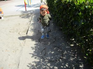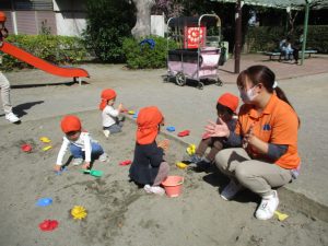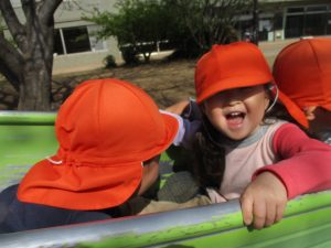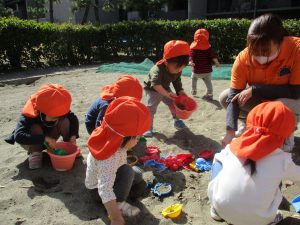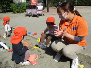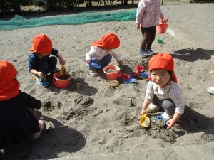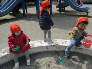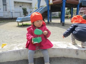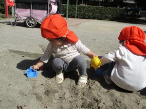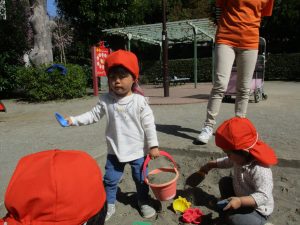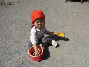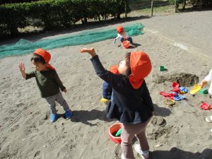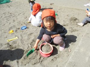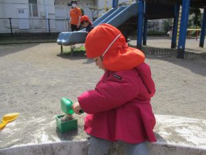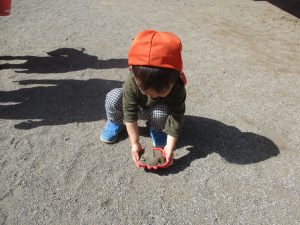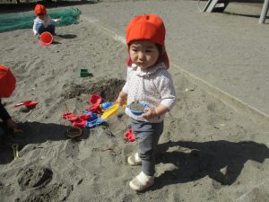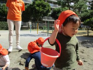 砂場ではシャベルを使ってカップに砂入れひっくり返して型を取ったり、バケツに砂を大量に入れバッグに見立て楽しそうに持ち運んでいました♪