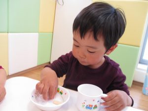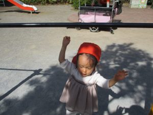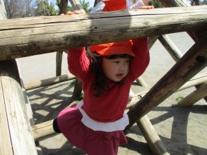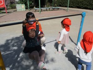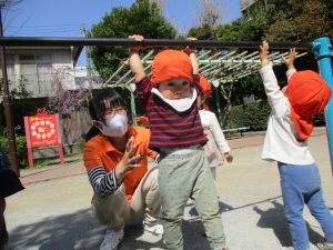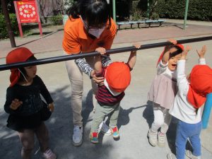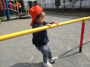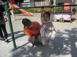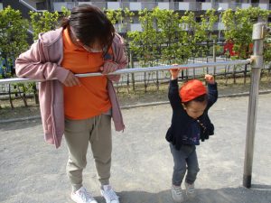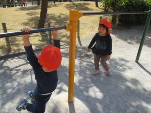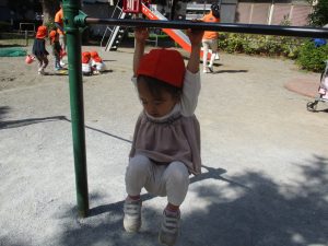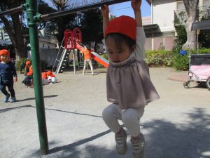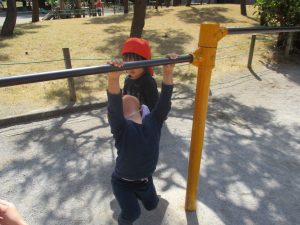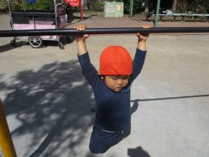 砂場でのままごとや鉄棒のぶら下がりを楽しみましたが、高い鉄棒にもぶら下がろうとする場面もあり遊び方に力強さが出て参りました。