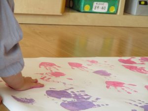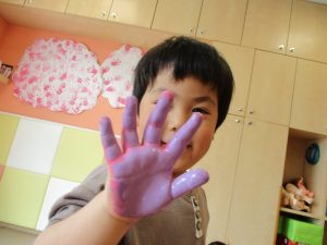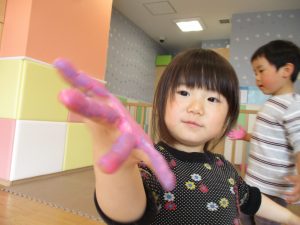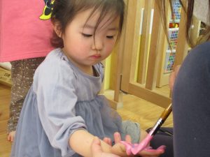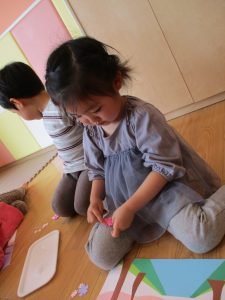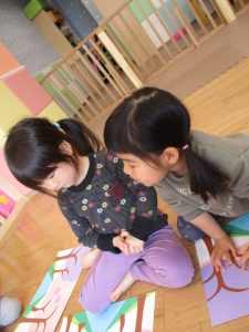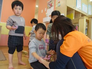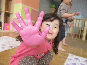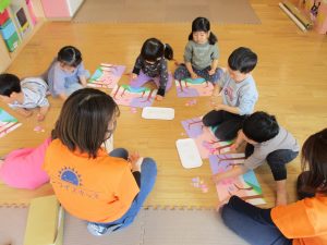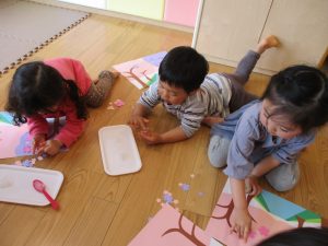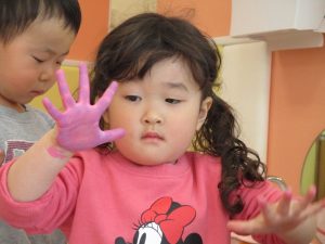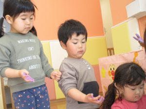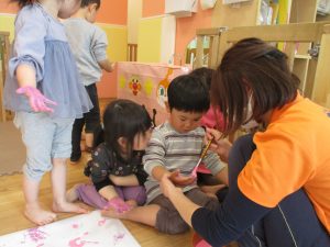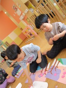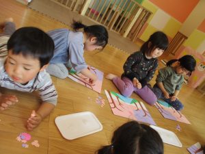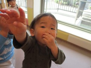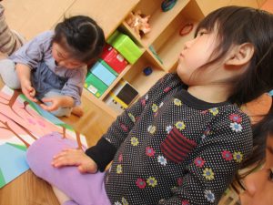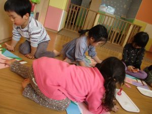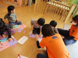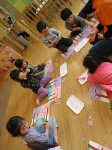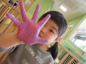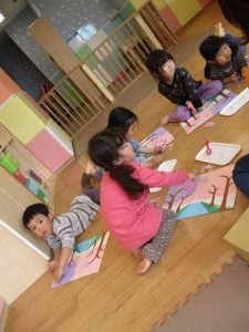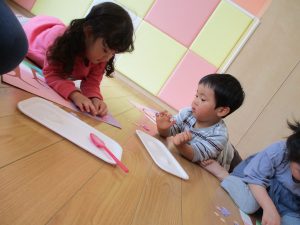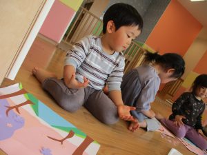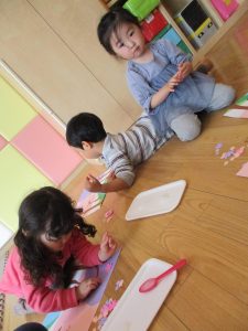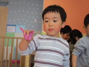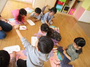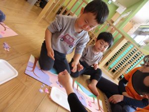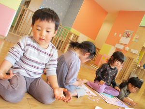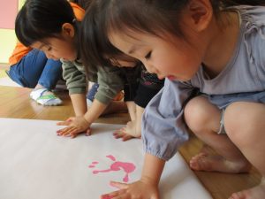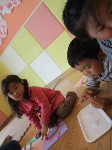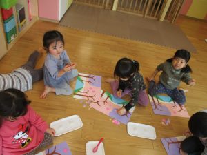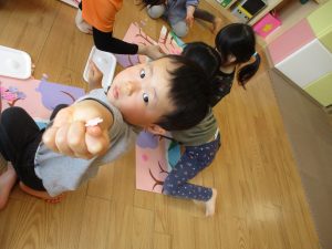 「紙にやるんだよ!」や「床にはやらないんだよ!」と子ども達同士で互いに確認し合う姿が何とも逞しく思います!