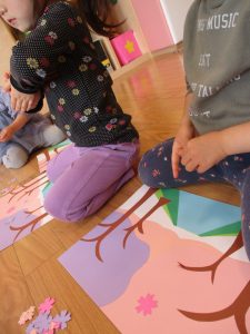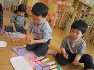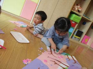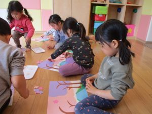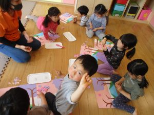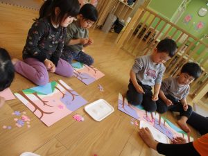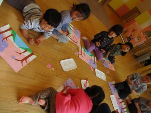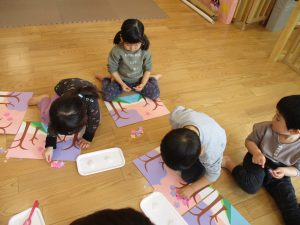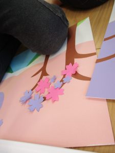 リラックスした雰囲気の中、桜の花びらに適量の糊をつけてそれぞれの桜の木を仕上げておりました!