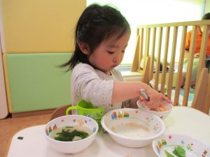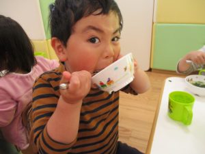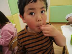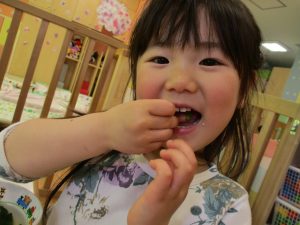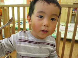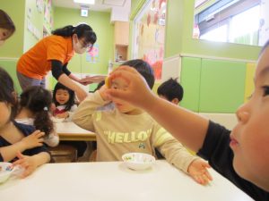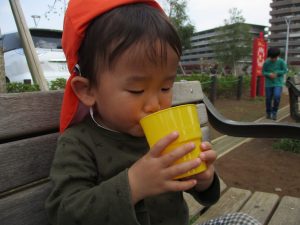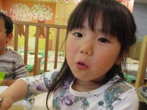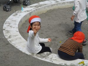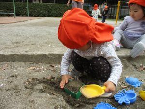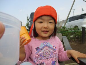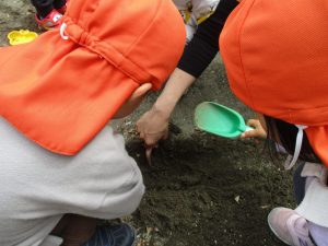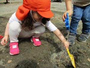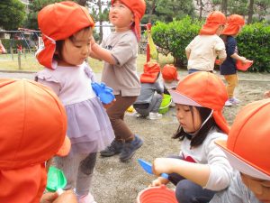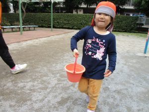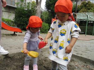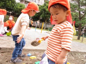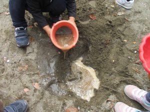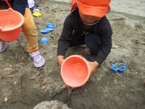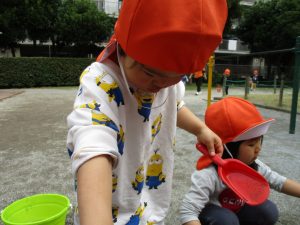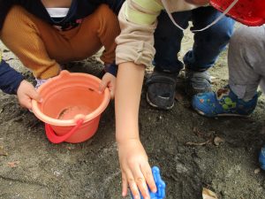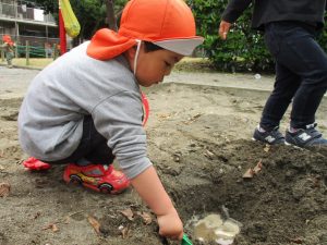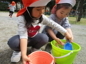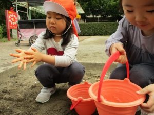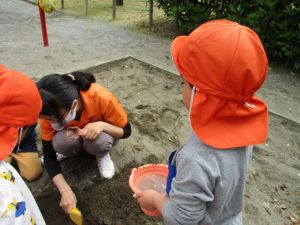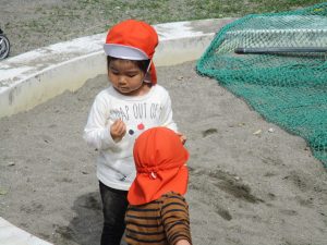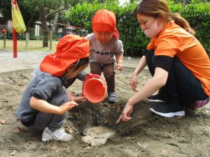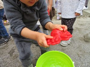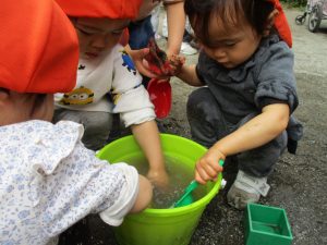 皆でどろ遊びを楽しみましたが「お砂は目に入ると危ないから、上からサラサラやらないんだよ」と2歳児さん0.1歳児のお友達に優しく遊び方を教えていました。