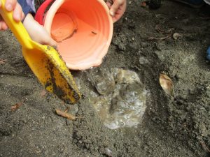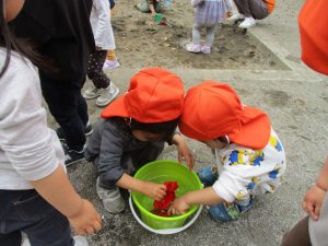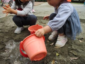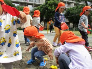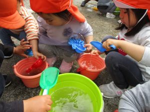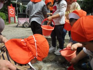 2歳児さんを中心にバケツで水を運びましたが穴を掘り水を貯めて楽しそうに遊んでいました。