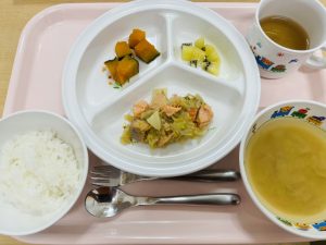 ご飯 味噌汁 鮭のちゃんちゃん焼き かぼちゃの甘煮 キウイ