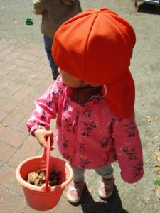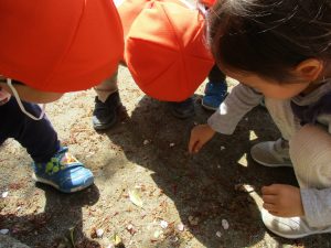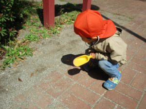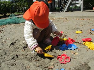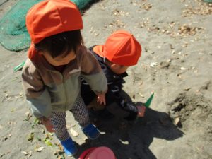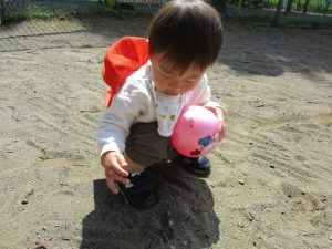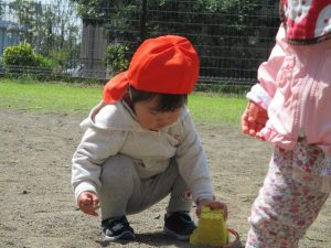 バケツに砂ではなく枯葉や枝や型抜きを入れて、お買い物ごっこに夢中です♪