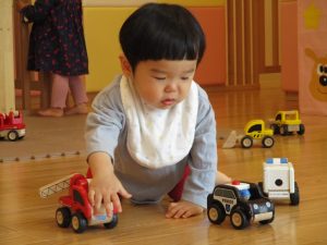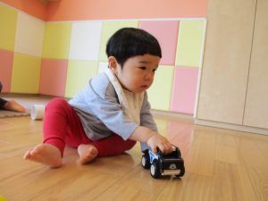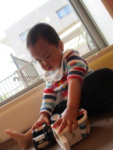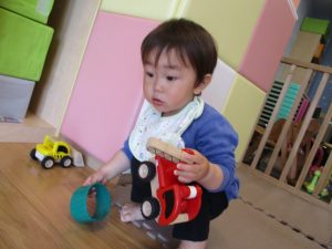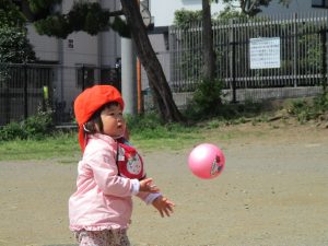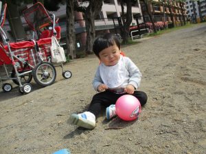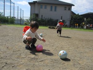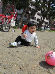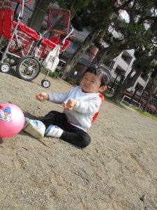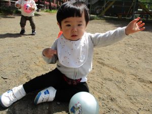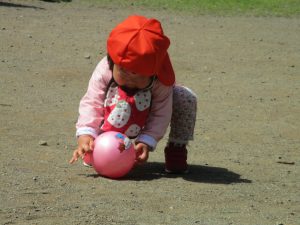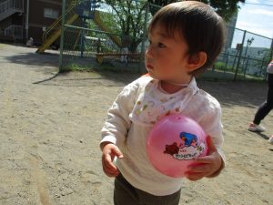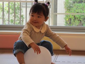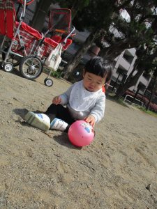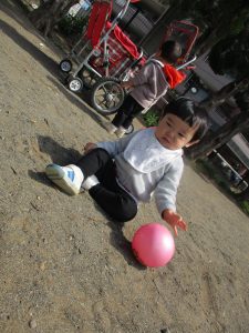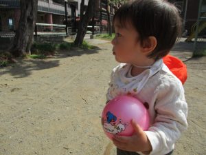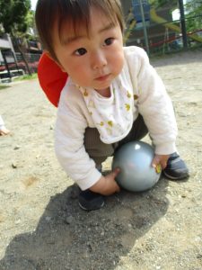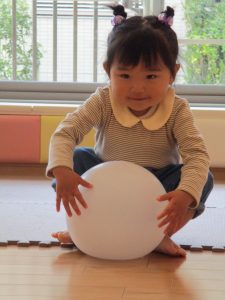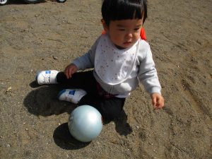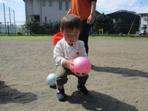 ボール遊びがとても楽しいようで先生が転がしたボールを懸命に追いかけたり、お気に入りのボールを大事そうに抱えておりました。
