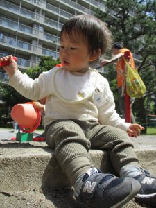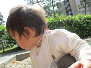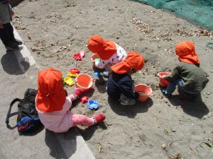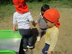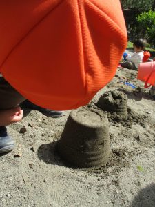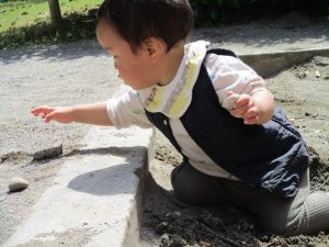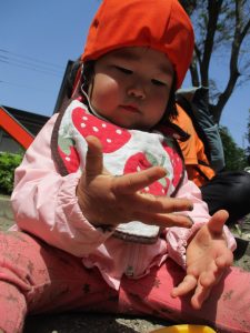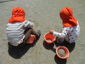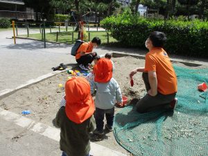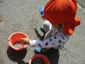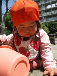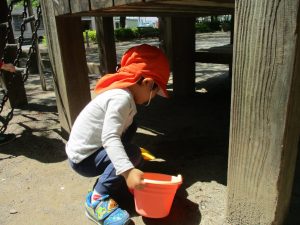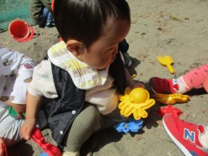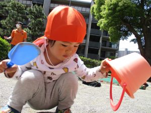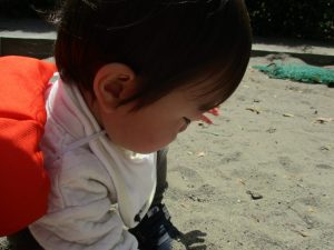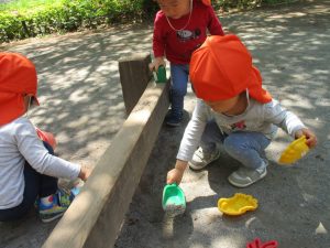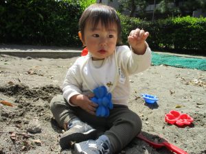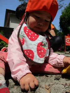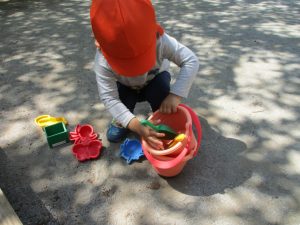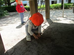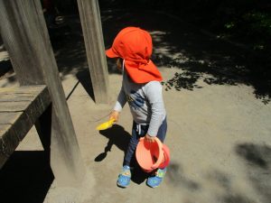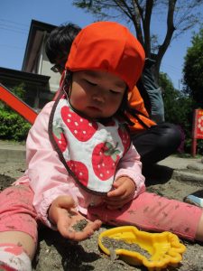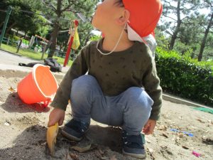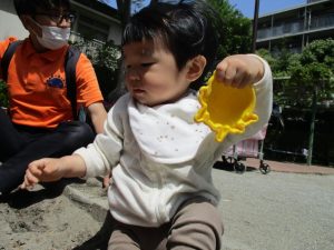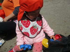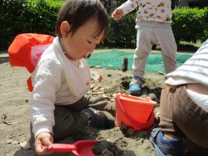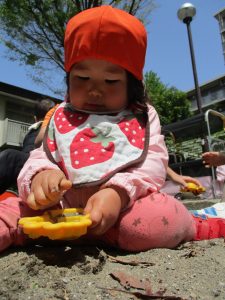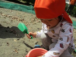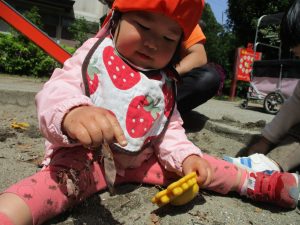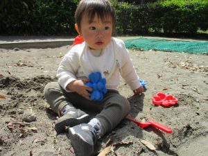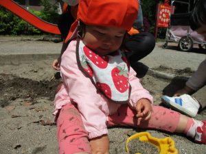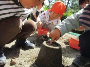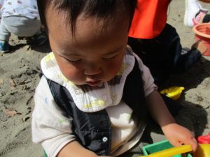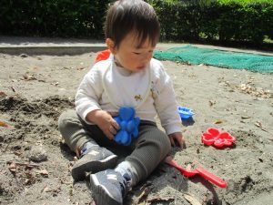 1歳児クラスのお友達も型抜きに砂を入れたり、砂の感触を味わったり、先生と一緒にすべり台を楽しむ等、楽しそうに遊べております♪