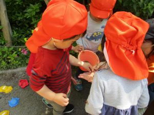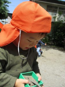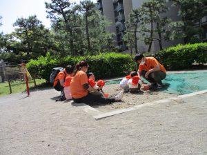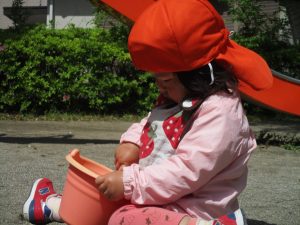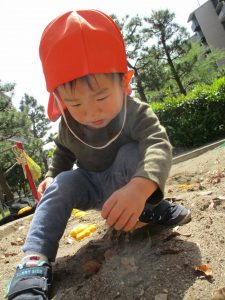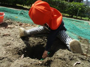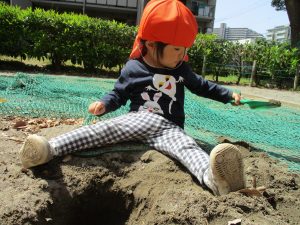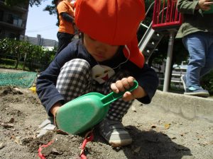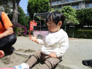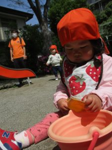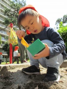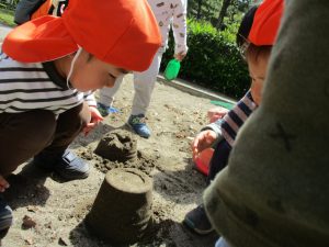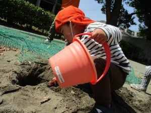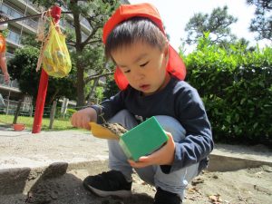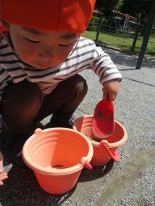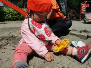 先生が作ってくれた大きいケーキに驚いたり、スコップを使ってバケツに一生懸命砂を入れたり等、それぞれの遊び方を心行くまで楽しんでいます♪