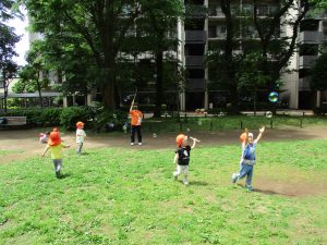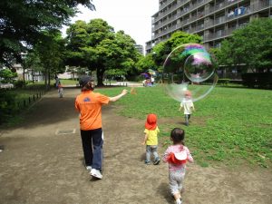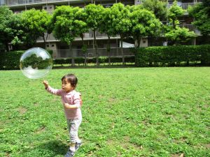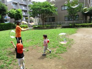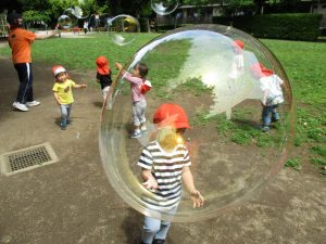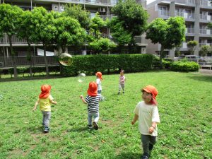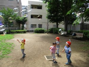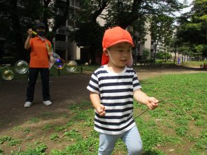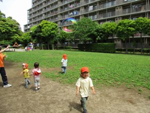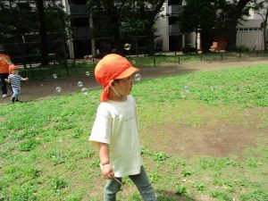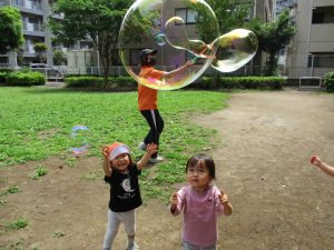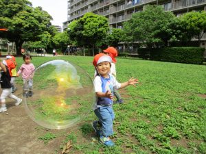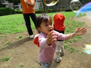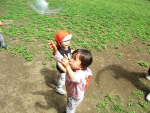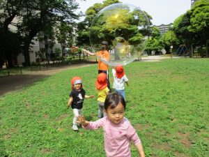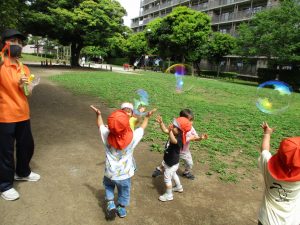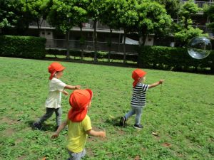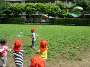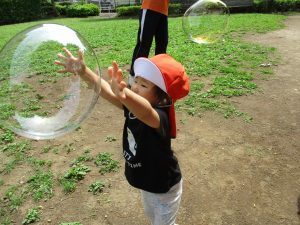 先生が上手にシャボン玉を作ってくれ、皆が追いかけながら思い切り体を動かして楽しく過ごせました。