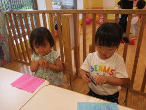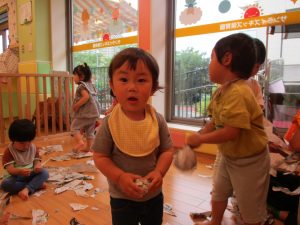 本日も雨天の為、室内で過ごしましたが新聞紙遊びや風船遊びに熱中する傍ら、2歳児クラスのお友達を中心にシール貼りの机上遊びも楽しみました!