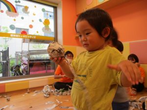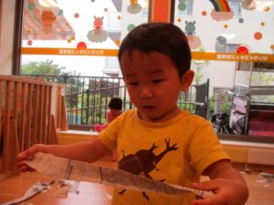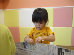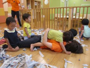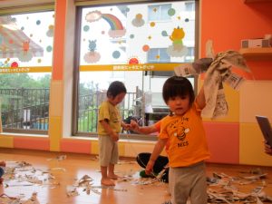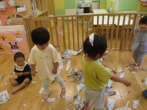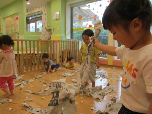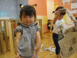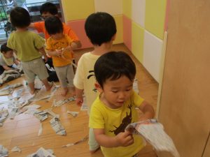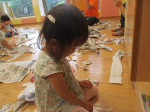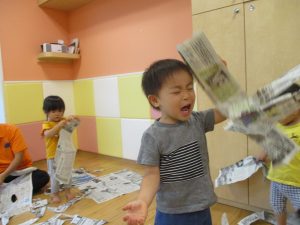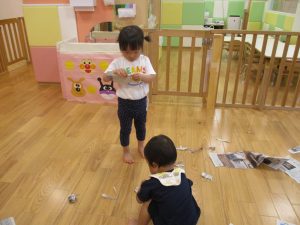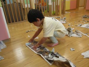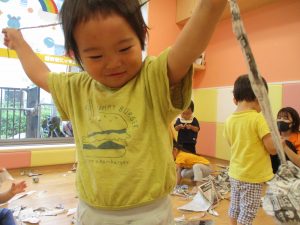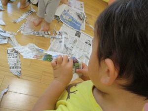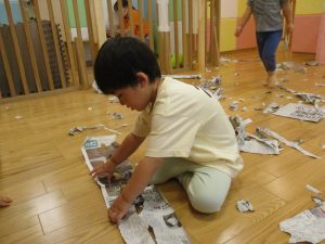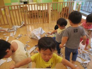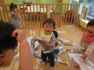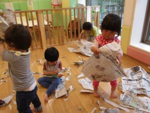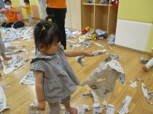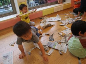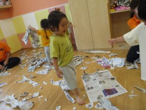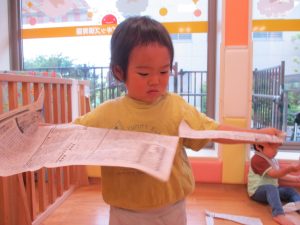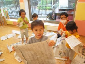 新聞紙遊びも体を動かしながら指先の感覚も同時に養えるので一石二鳥ですね!