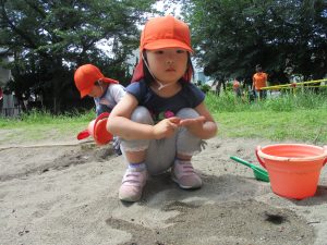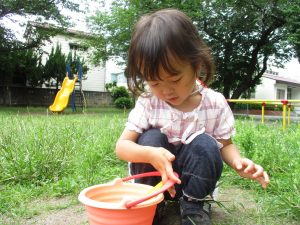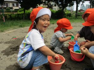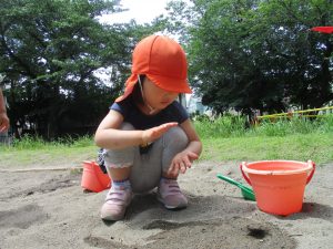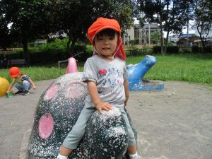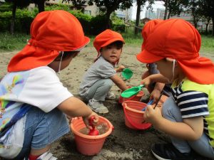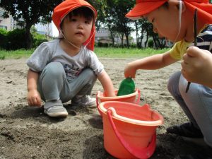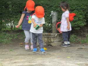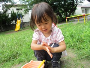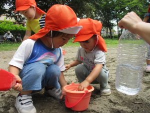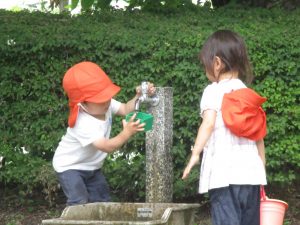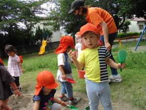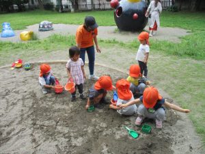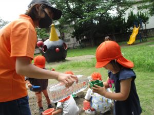 公園内では夏の水遊びに備えて、水や泥遊びを取り入れております。