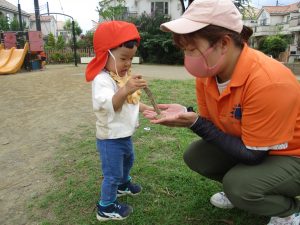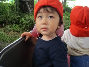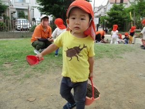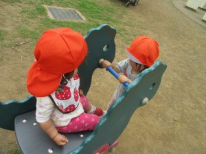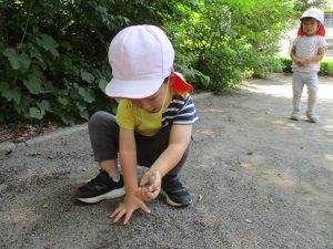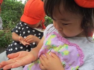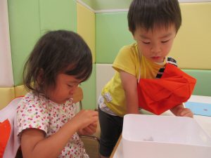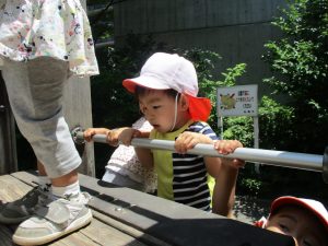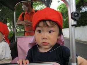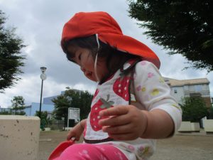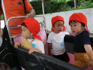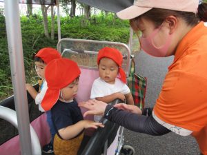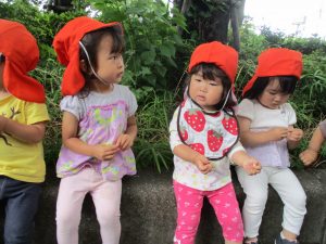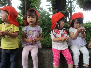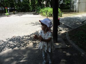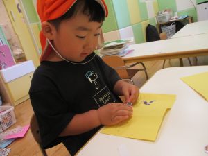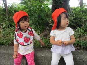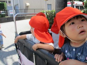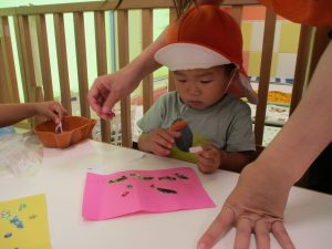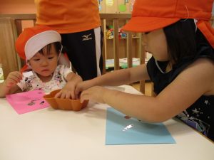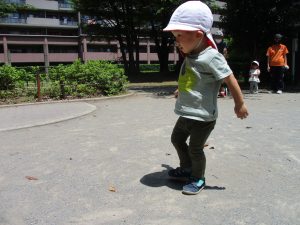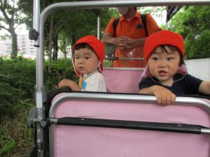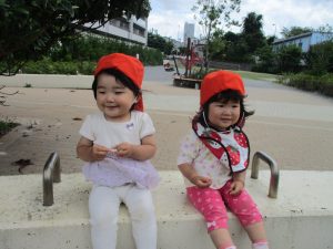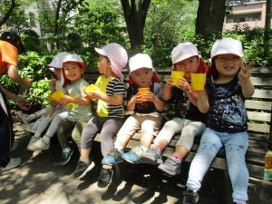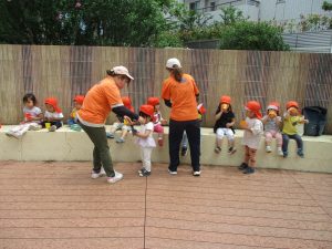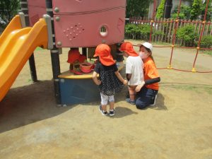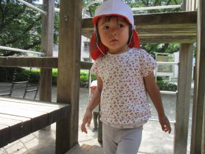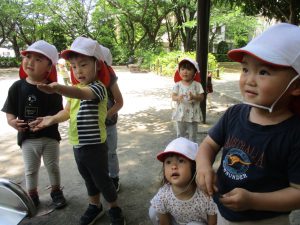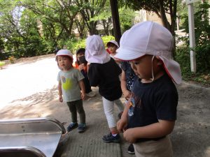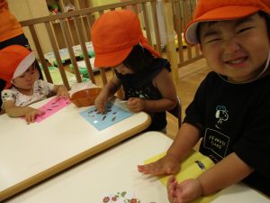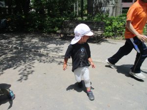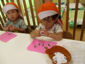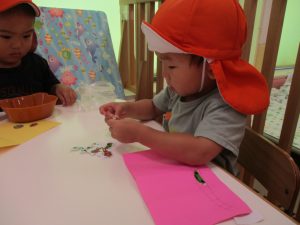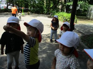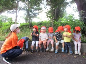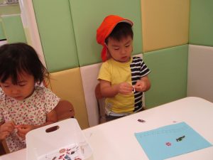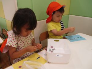 2歳児クラスのお友達は暑さ対策として室内にてシール貼りを楽しんでから、ホームグラウンドである「さくら公園」まで遊びに行きました!