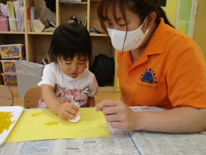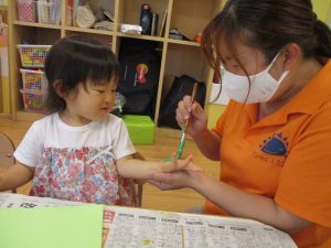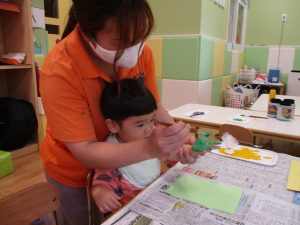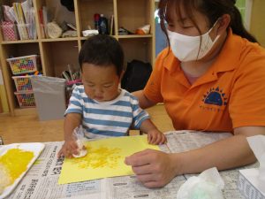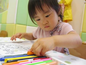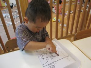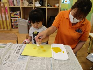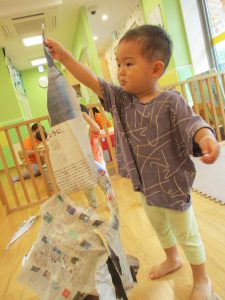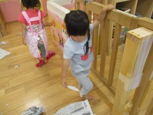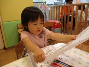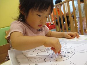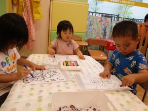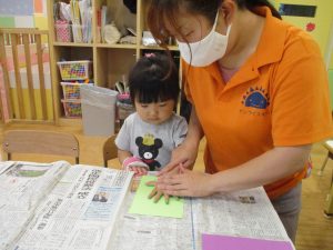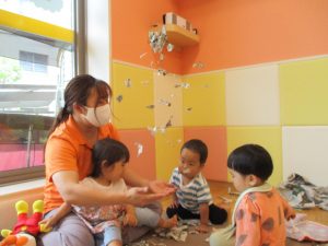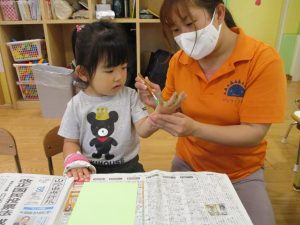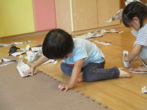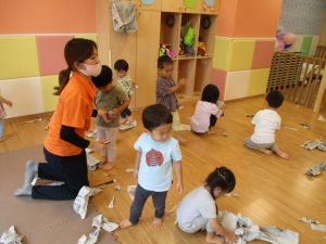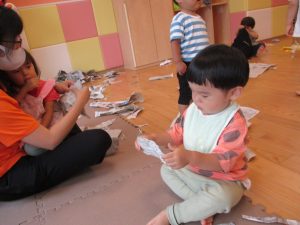 新聞紙遊びや塗り絵も積極的に活動の中に盛り込ませて頂きましたが、2歳児クラスのお友達を中心にとても遊び込めている印象でした。
