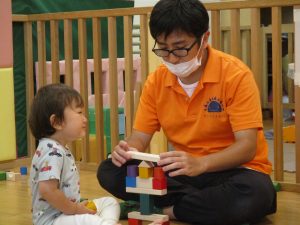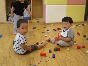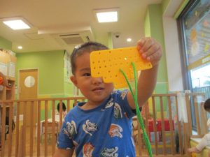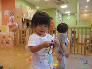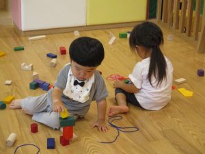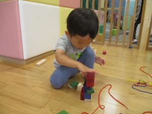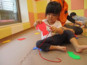 昨日とは少し遊びのバリエーションを変えて、紐通しや積木、シール貼りもふんだんに用意致しました。