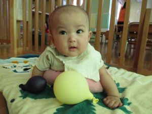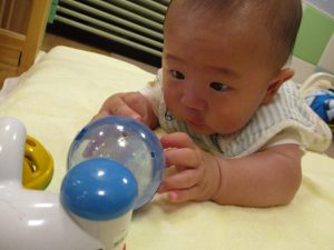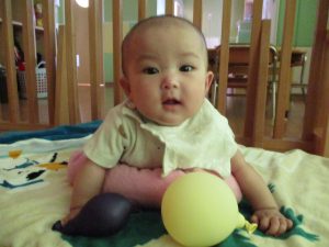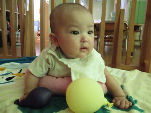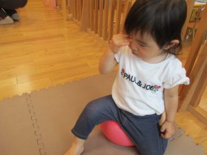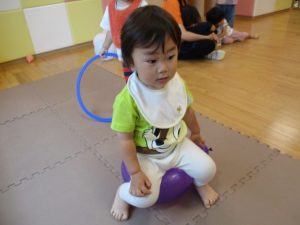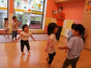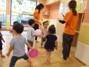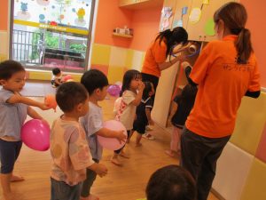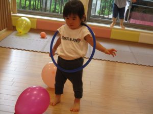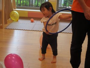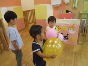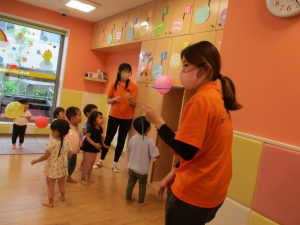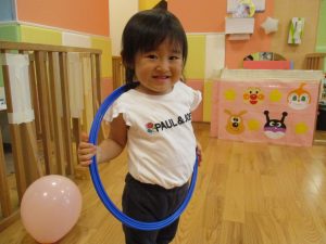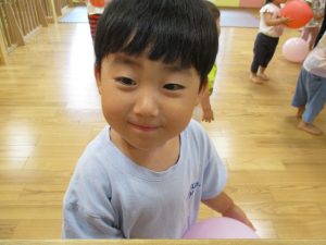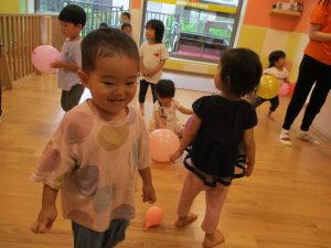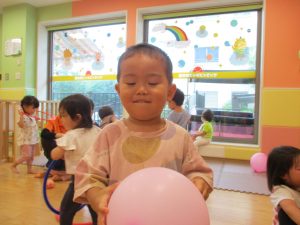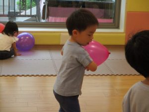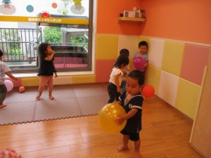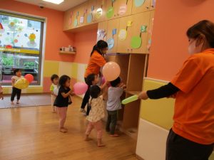 好きな色の風船を大切そうに抱えたり、投げた風船を先生と一緒に追いかけて掴まえる等、楽しそうに過ごしておりました!