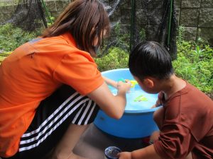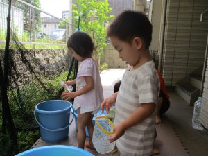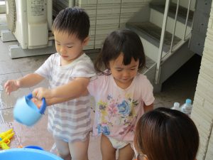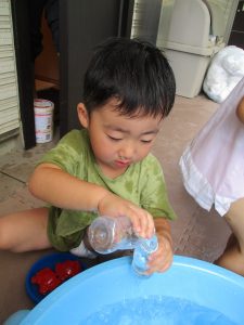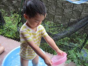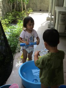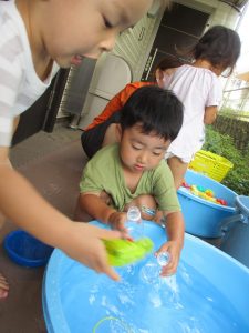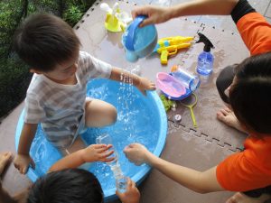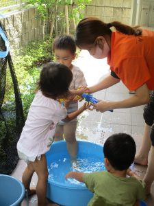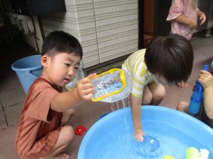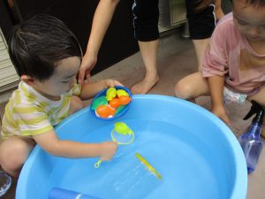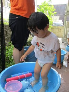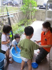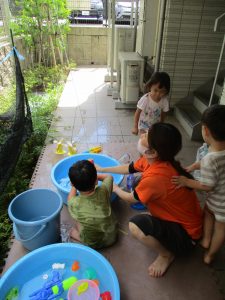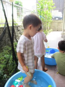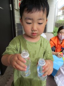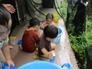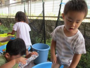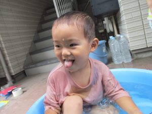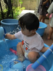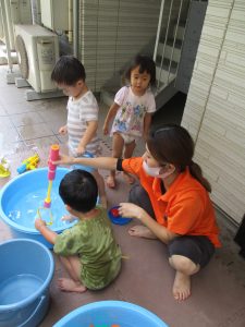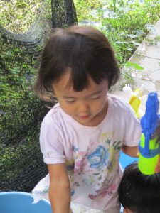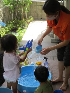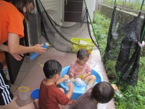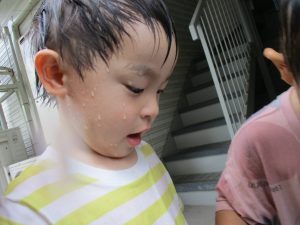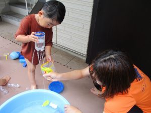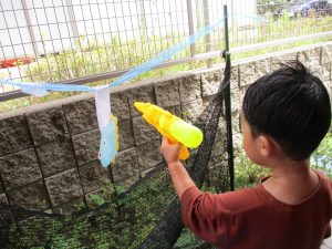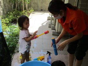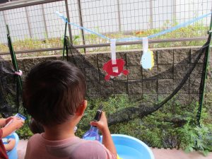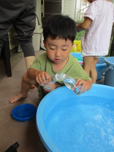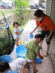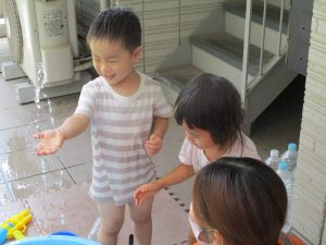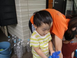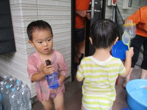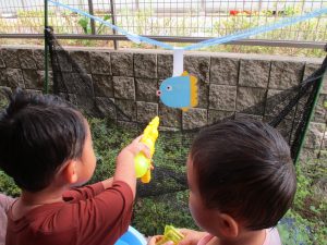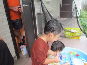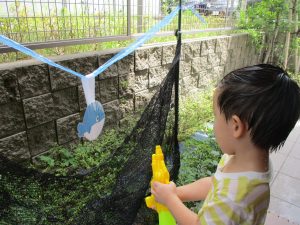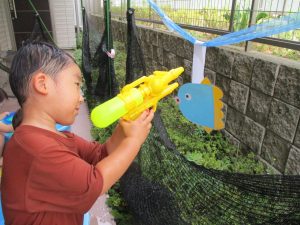 「男子会」となりましたが豪快に水を被ったり、手作りの的を目掛けて水鉄砲を発射し楽しそうに遊んでいました。