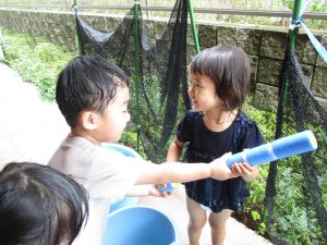 ままごと玩具を通して水の流れを観察する姿がなんとも可愛いですね♪