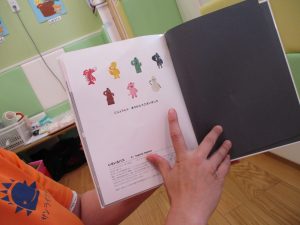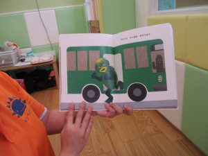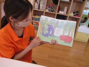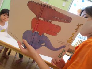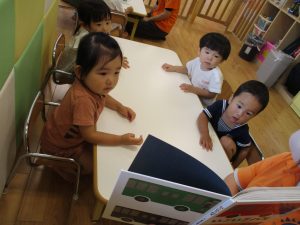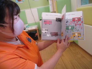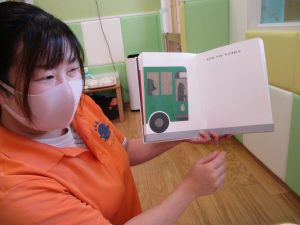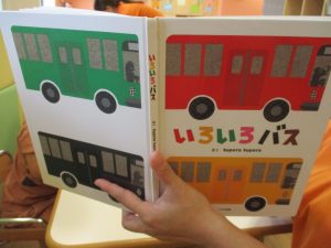 「いろいろバス」はバスの色にちなんだ様々なキャラクターが乗車してくると言った不思議の連続を味わえる絵本となっており、お子様達も終始絵本に目が釘付けとなっております♪