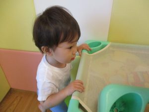 手作りの水遊び玩具から流れる水をじーっと眺める姿が何とも可愛いですよね。