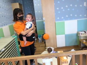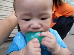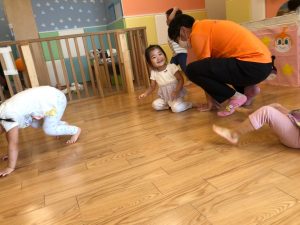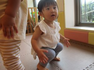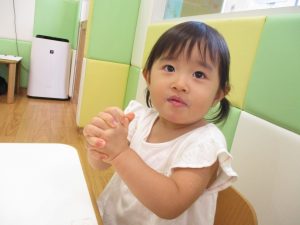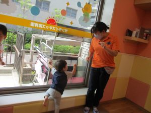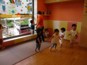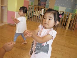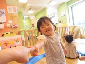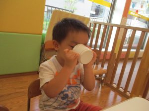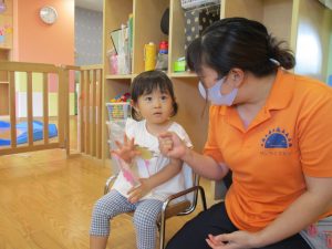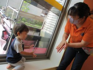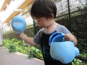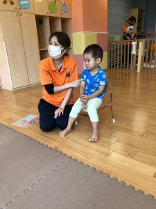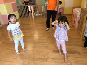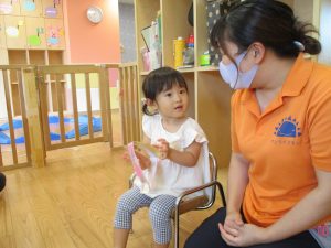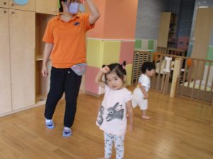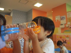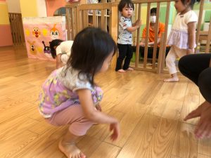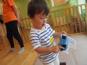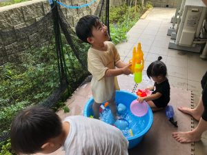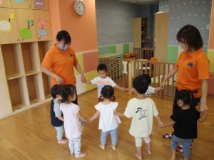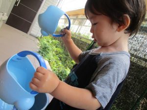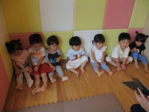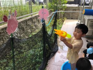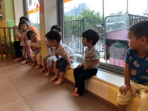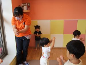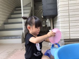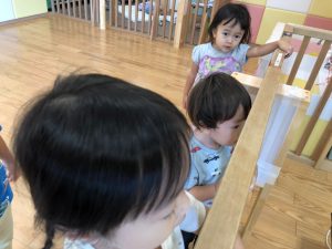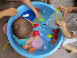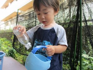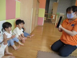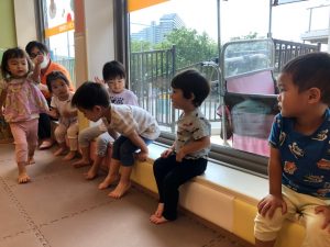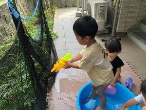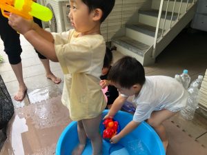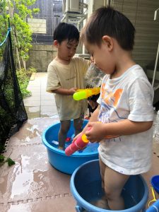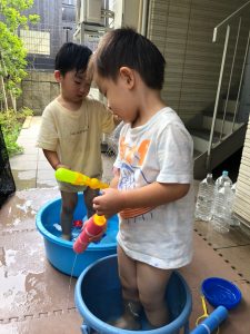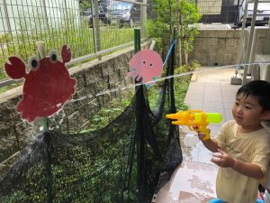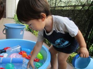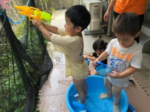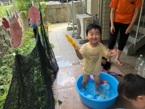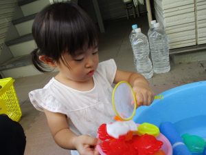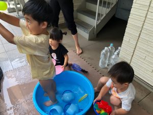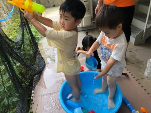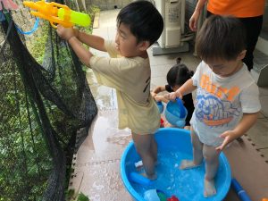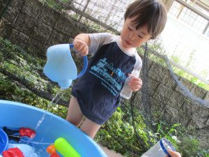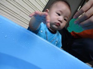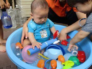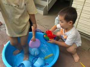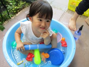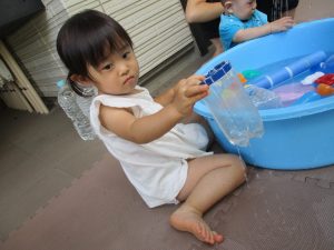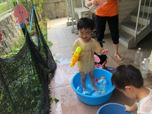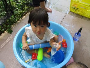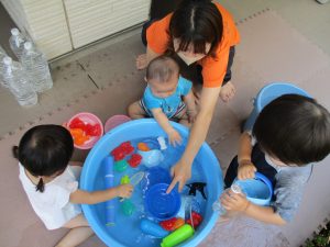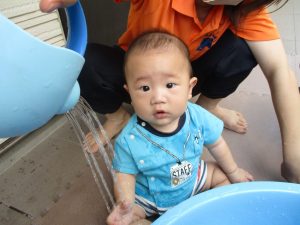 0歳児クラスのお友達も水と触れ合う時間を作り、水の気持ち良さに喜んでいました。