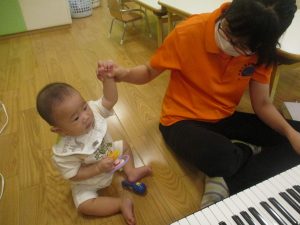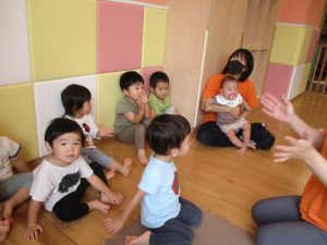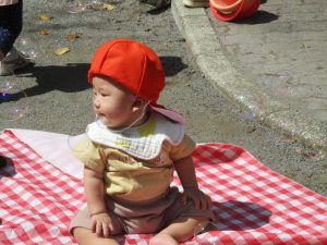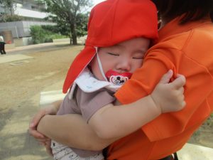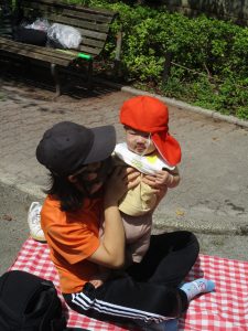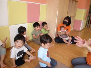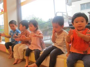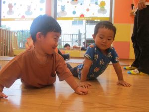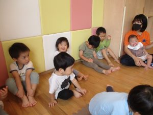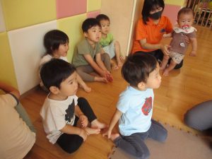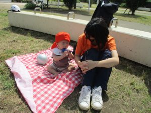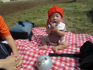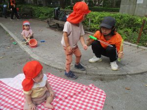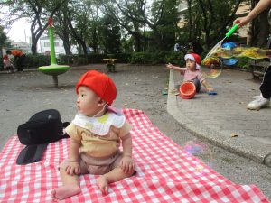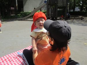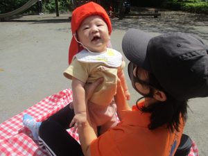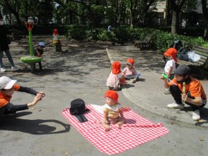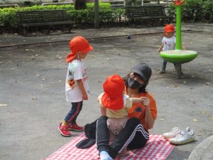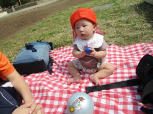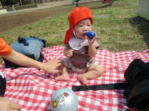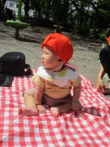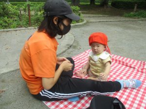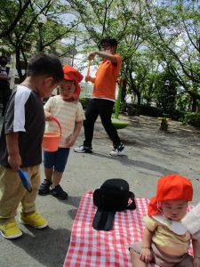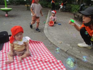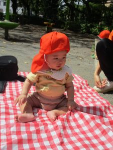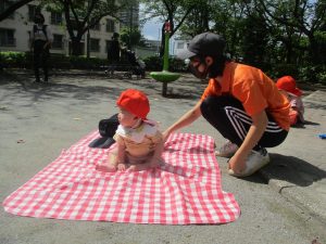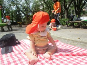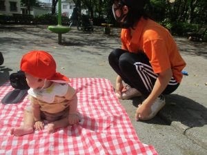 0歳児のお友達はレジャーシートの上でピクニック気分を味わい、気持ち良さそうに過ごしておりました♪
