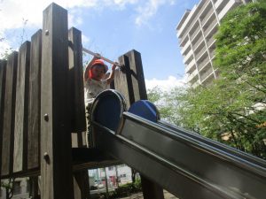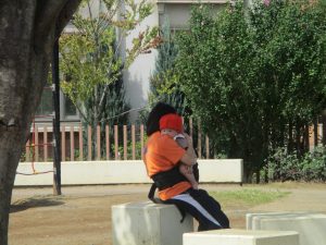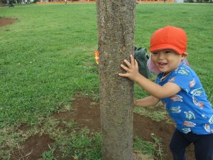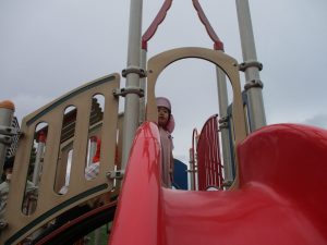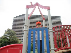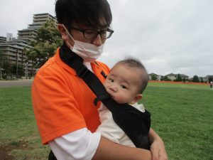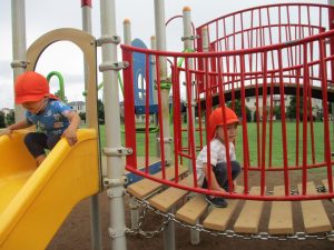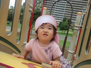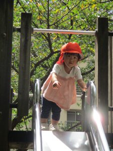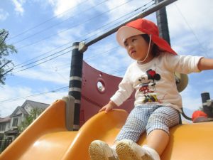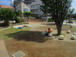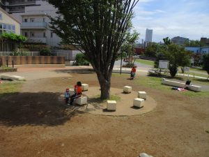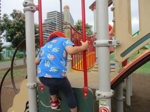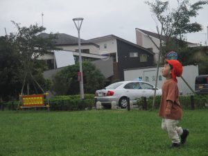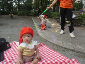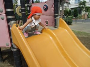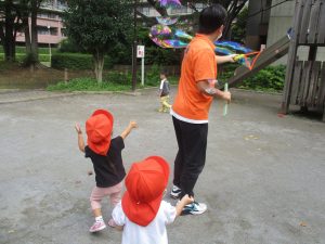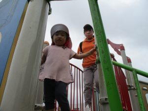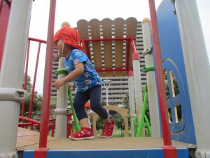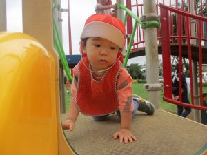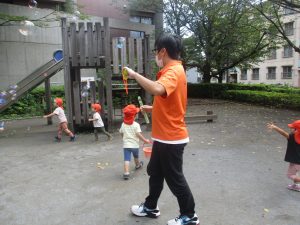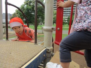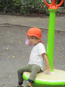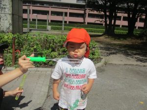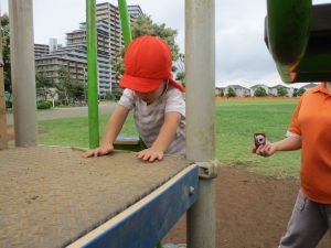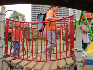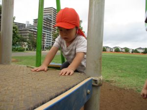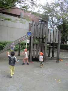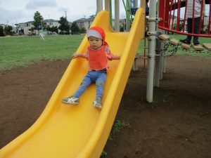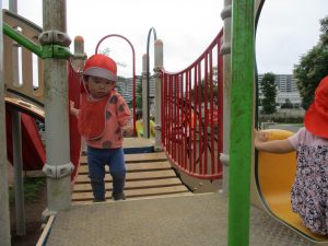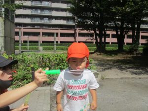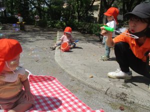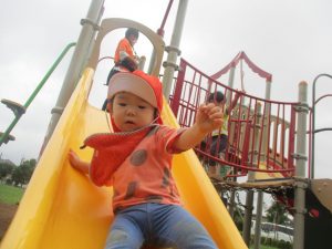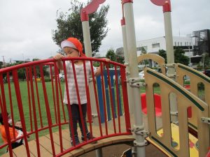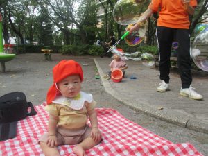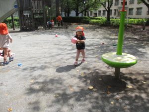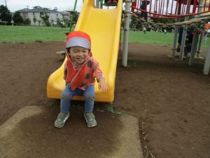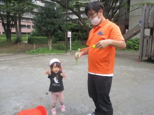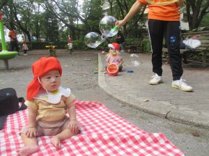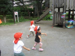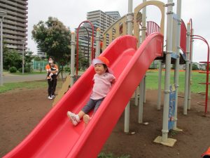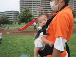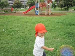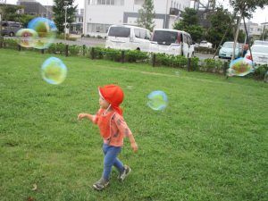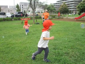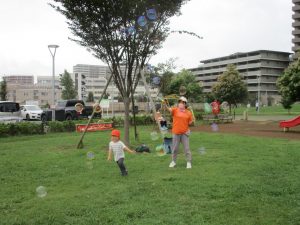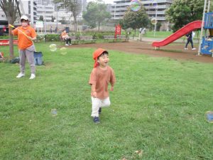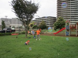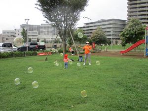 防災公園では固定遊具でたくさん体を動かして遊んだり、シャボン玉を楽しそうに追いかけていました。