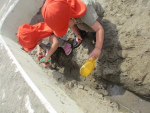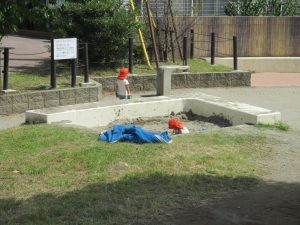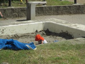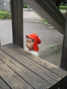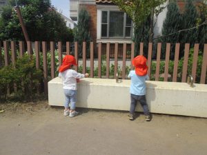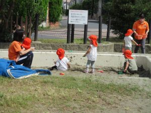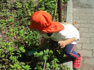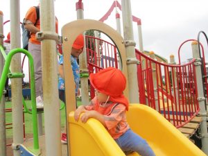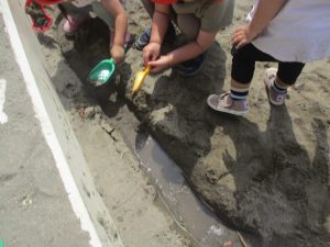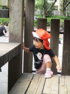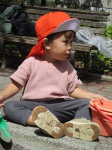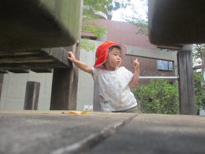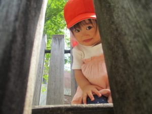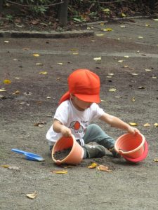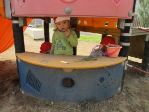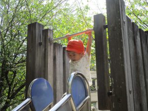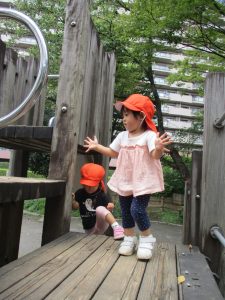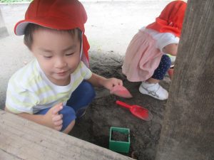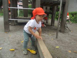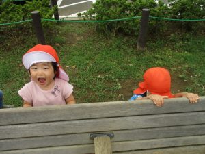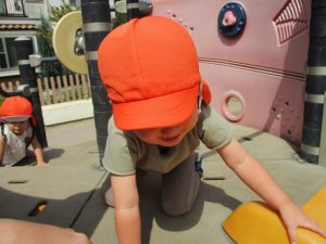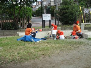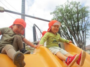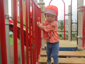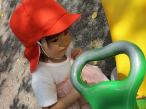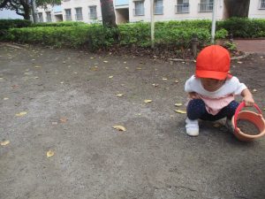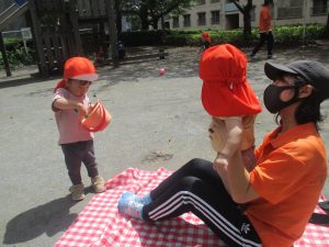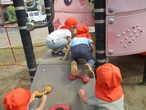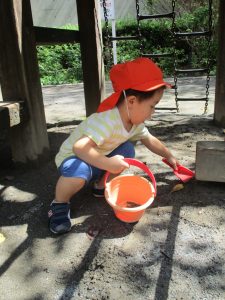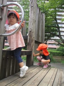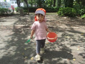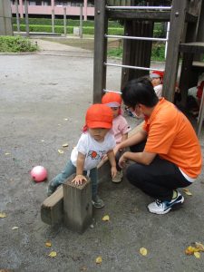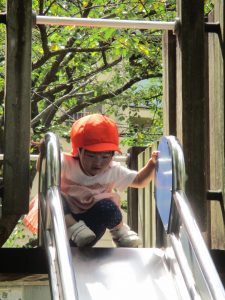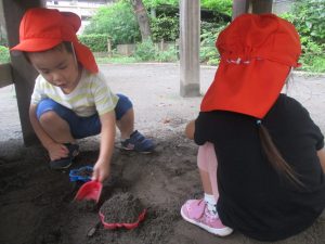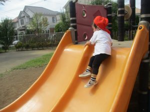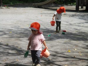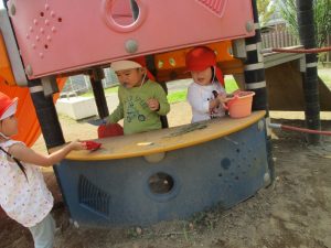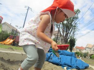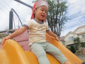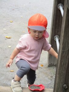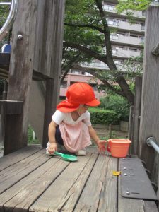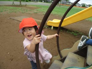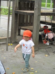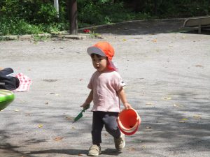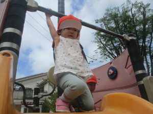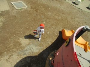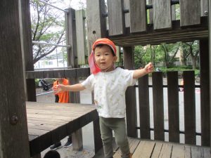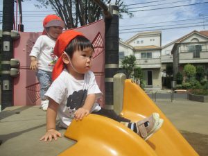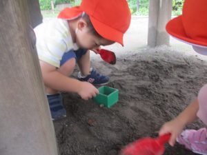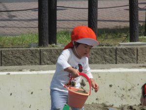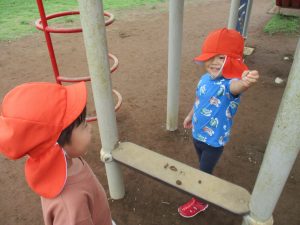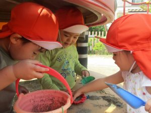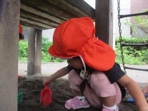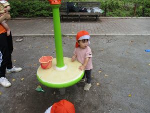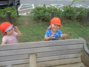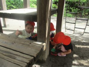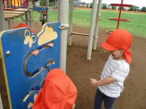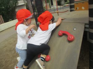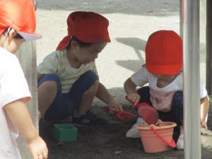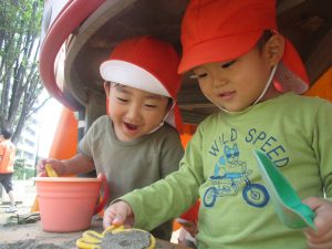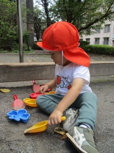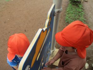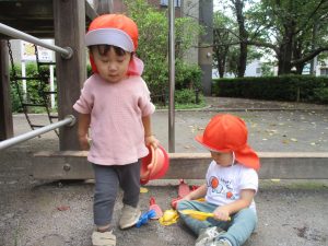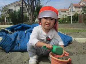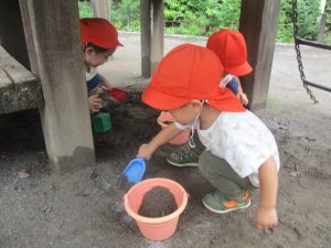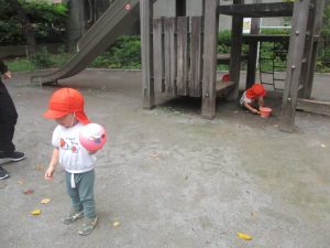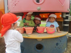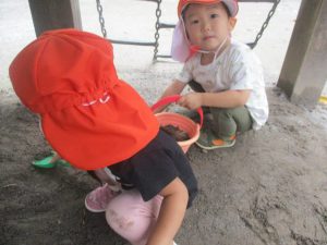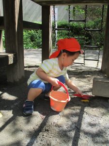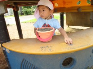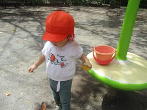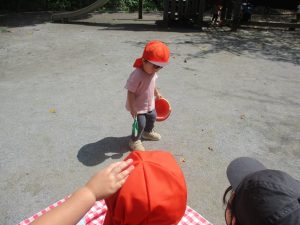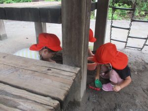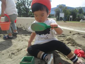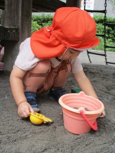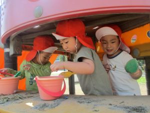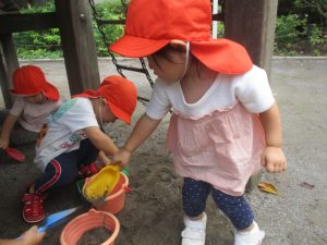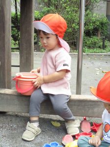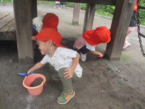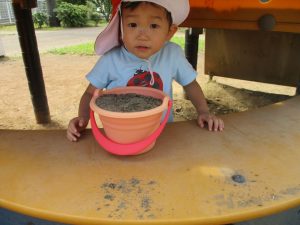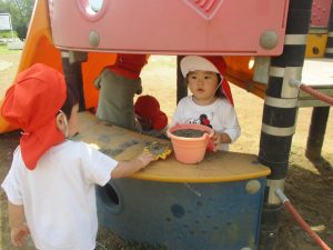1.2歳児クラスのお友達は固定遊具で体を動かしたり、砂場セットを使ってままごと遊びを存分に楽しみました!