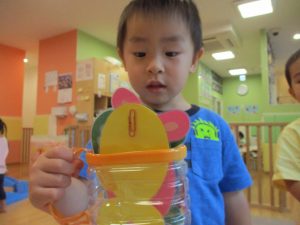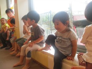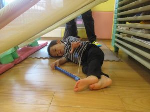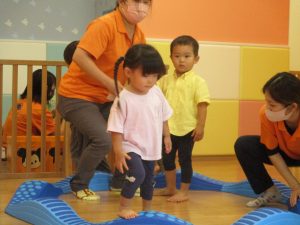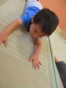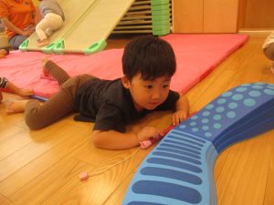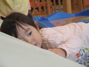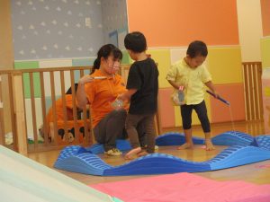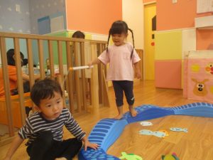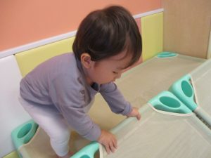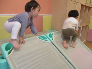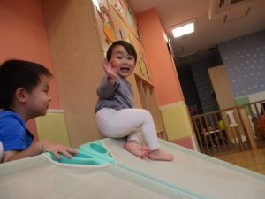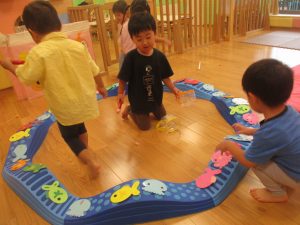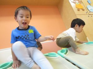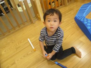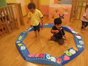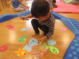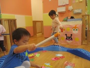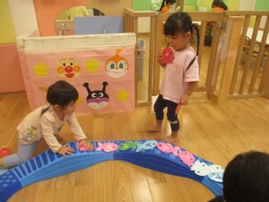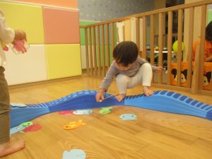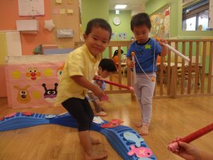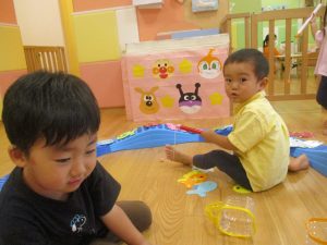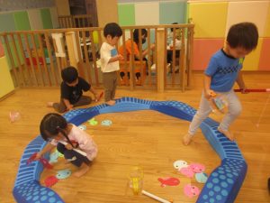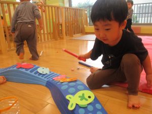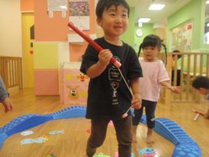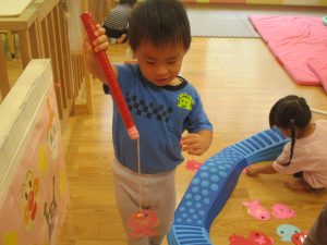 コット滑り台でたくさん体を動かして遊んだり、手作りの魚釣り玩具に夢中になる姿が多くありました。