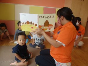 どんぐりころちゃんあたまはとんがって、、、との独特なフレーズの合わせて、どんぐりの仲間がだんだんと増えていく物語となっております。