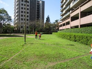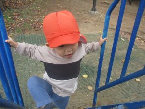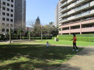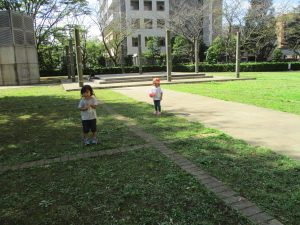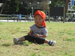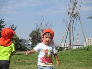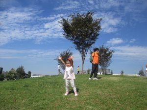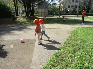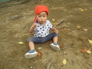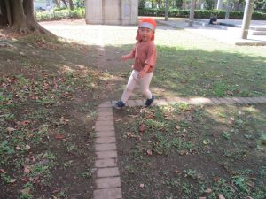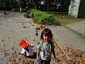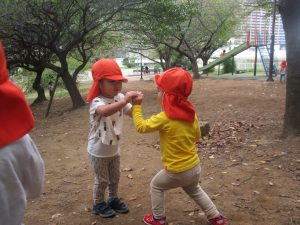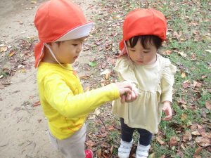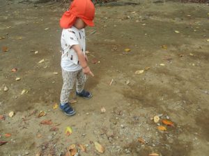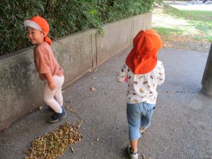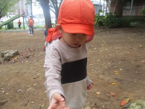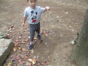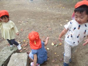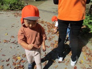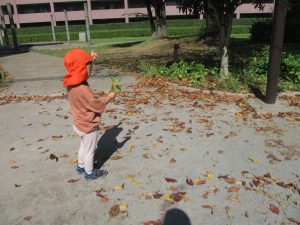 さくら公園も「衣替え」を行っており、大量の落ち葉があり両手で拾い集めてはその感触を味わっていました!