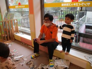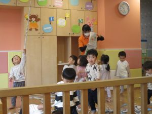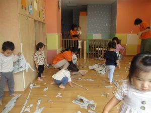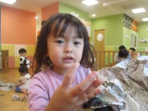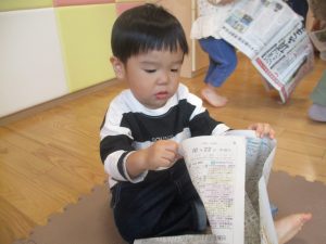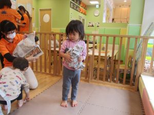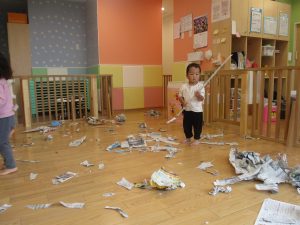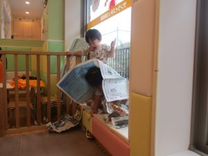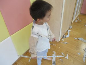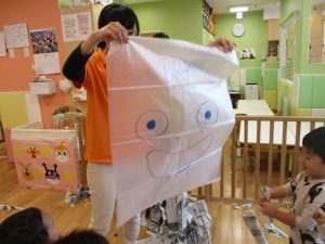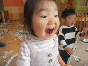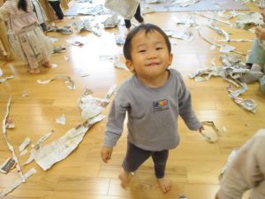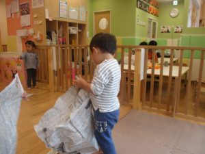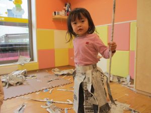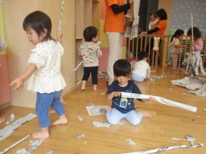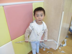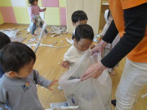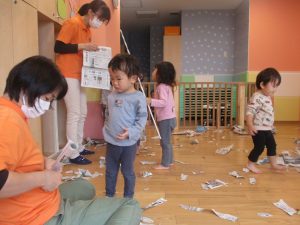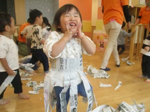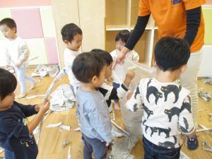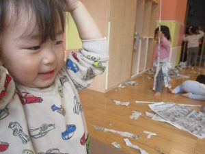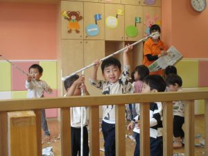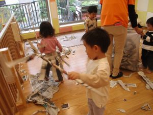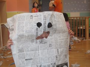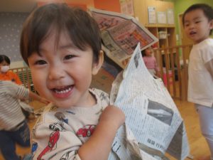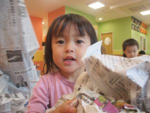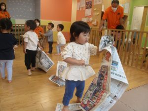 新聞紙遊びでは先生にとても長い棒を作ってもらったり、新聞紙おばけがたくさん登場し賑やかな時間となりました!