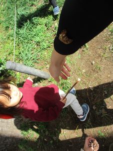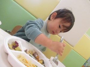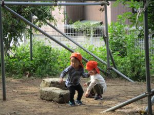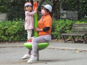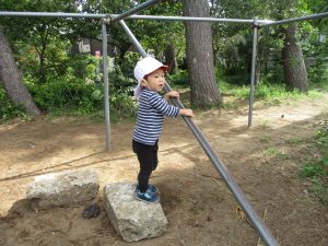 先生と一緒に固定遊具を使って思い切り体を動かして遊んだり、砂場セットでのままごと遊びに夢中でした!