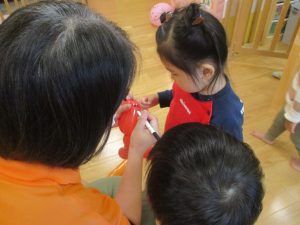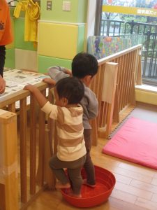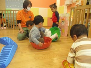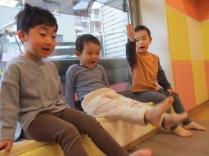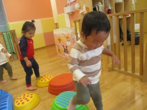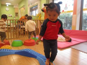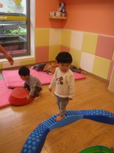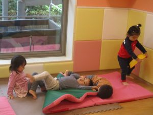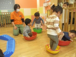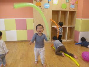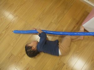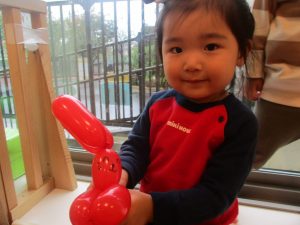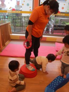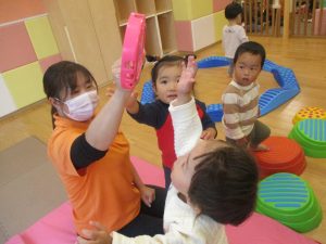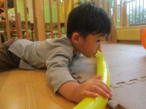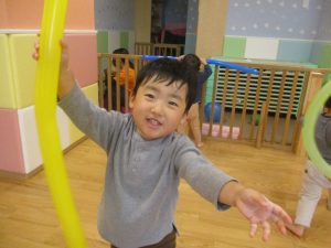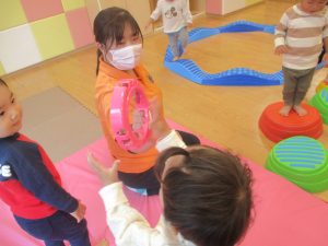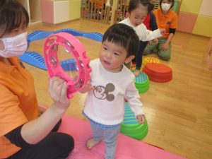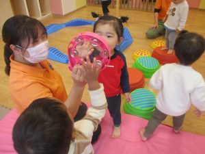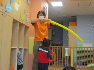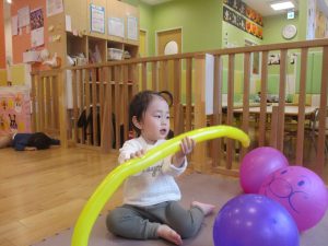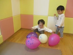 室内ではサーキット遊びを楽しんだりカラーバルーンを使って楽しく過ごしました。