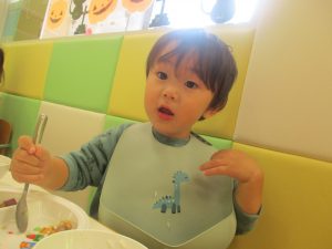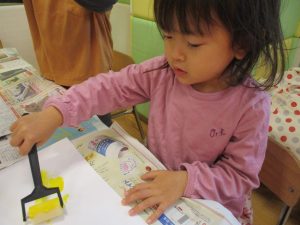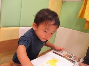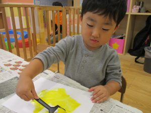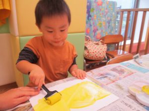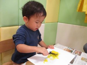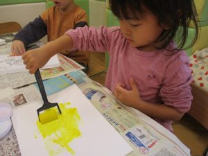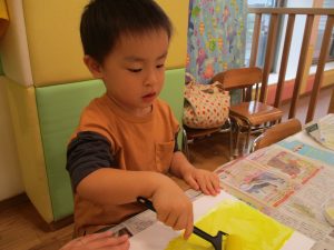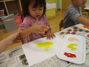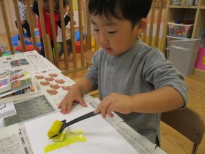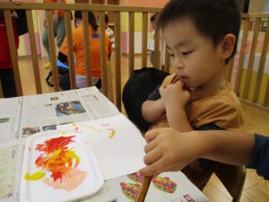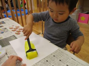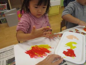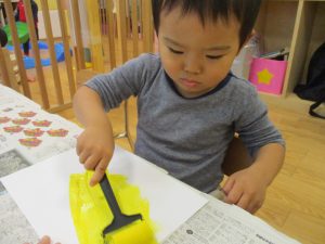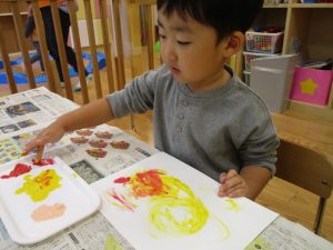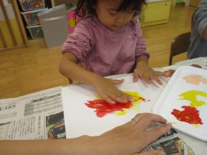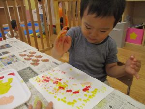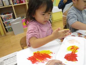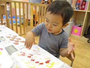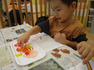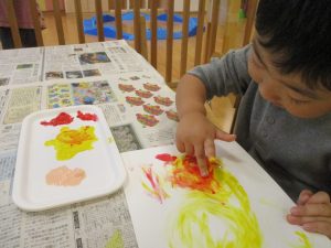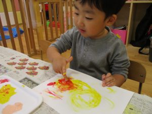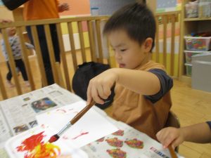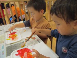 2歳児クラスのお友達は秋の深まりを感じさせる絵の具製作を楽しみました!