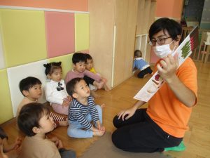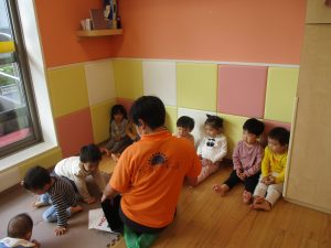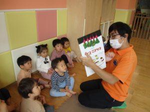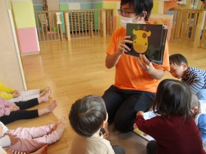 普段は横開きの絵本が主流の為、物珍しさと絵の大きさの迫力にお子様達は眼が釘付けとなっております♪