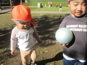 先生と触れ合い遊びを楽しんだり、カラーボールや音の鳴る玩具を使って楽しそうに遊んでおりました。