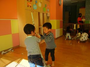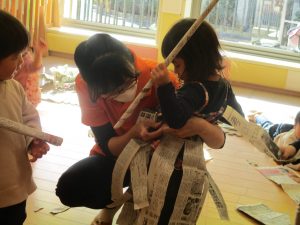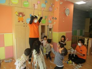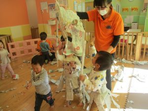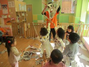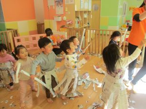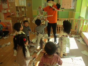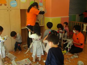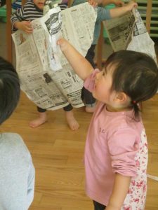 新聞紙遊びはバリエーションが効き、お子様達も先生達も存分に楽しむ事が出来ますね。