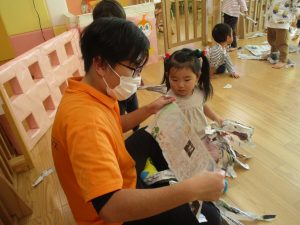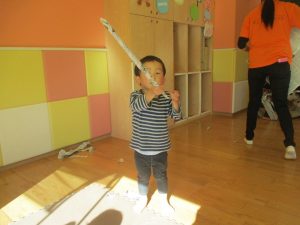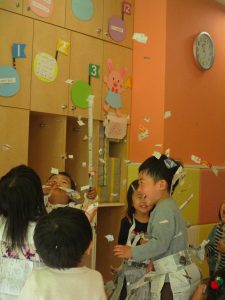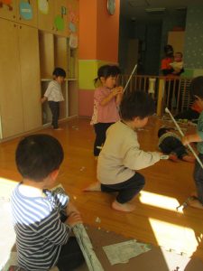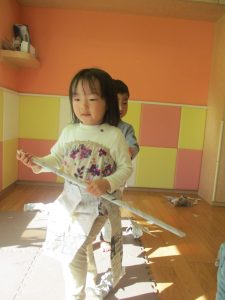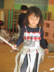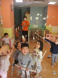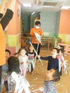 先生にヒラヒラ衣装やながーい棒を作って貰ったり、新聞紙吹雪を撒いてもらい、皆が大興奮の中楽しく過ごす事が出来ました!