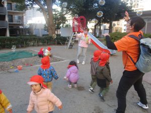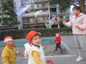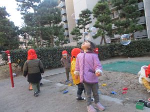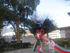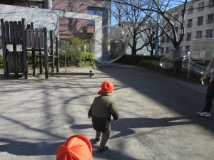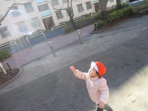 寒空にシャボン玉が飛んでいく姿もとてもきれいに映りますね♪