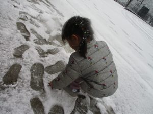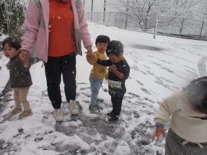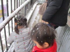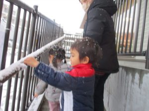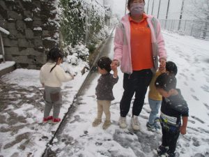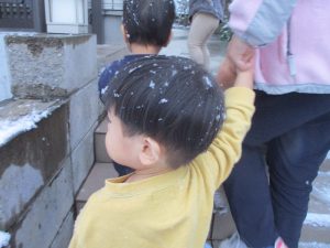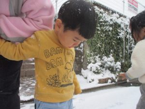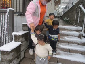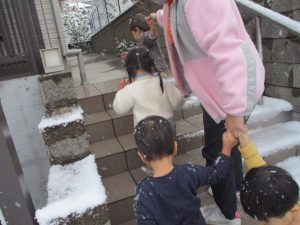 夕方に雪に触れ合いたいお子様達と先生で、安全を確保しながら雪の感触を味わいました。