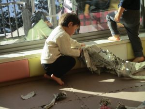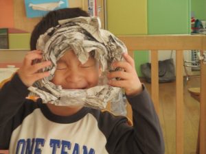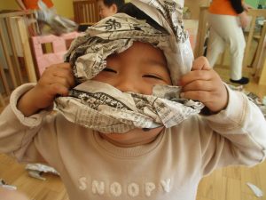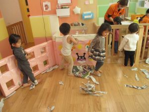新聞紙遊びを通して思い切り体を動かしたり、園前に積もる雪にならい新聞紙を雪に見立てては「パラパラ雪~♪」と室内にも新聞紙雪を降らす姿もあり、非常に素敵な遊び方をしておりました!