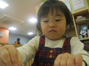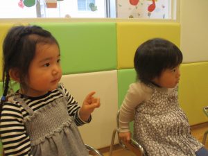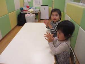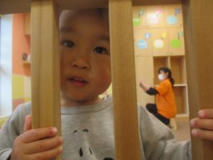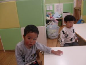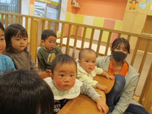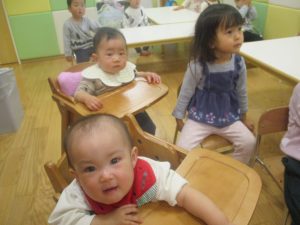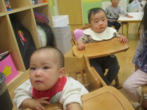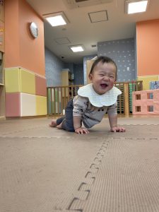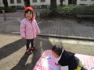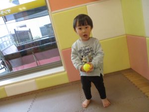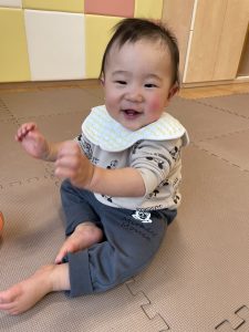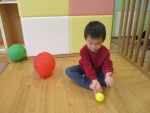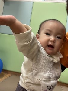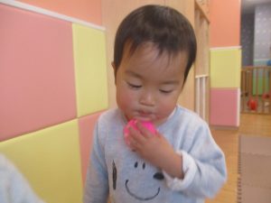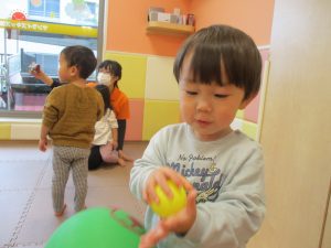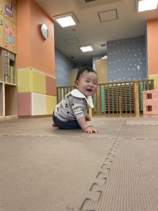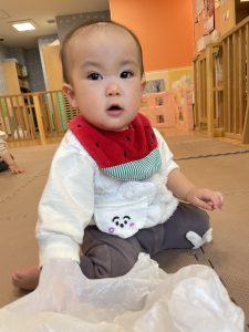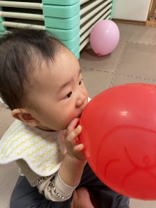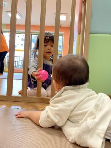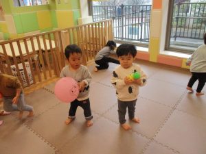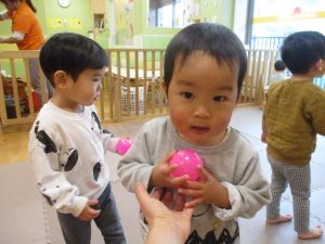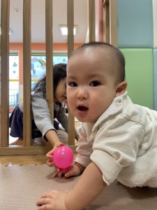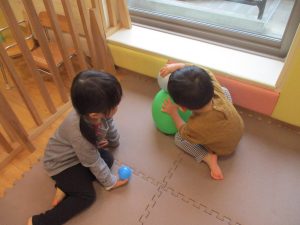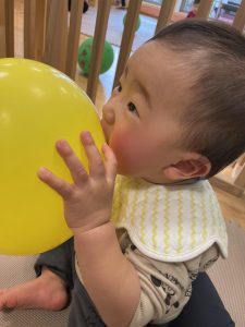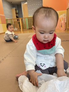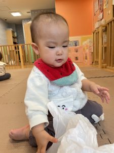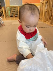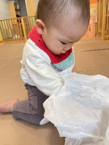 0歳児クラスのお友達は1.2歳児クラスのお友達が戸外散歩中に、広い保育室を使ってボール遊びを楽しんだりビニール袋の感触を味わっておりました!