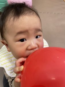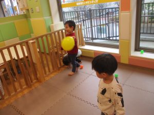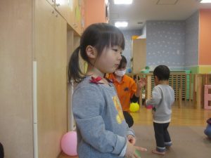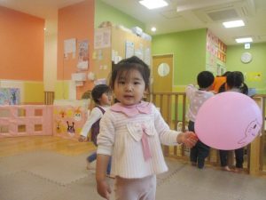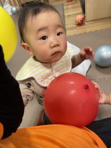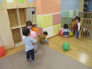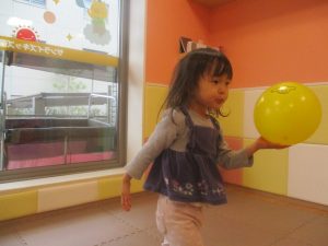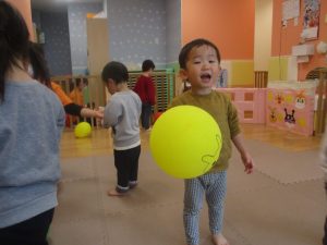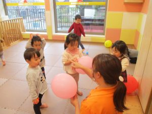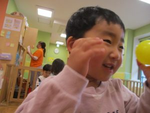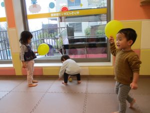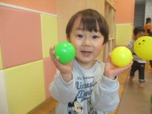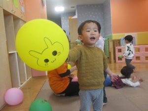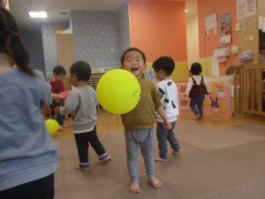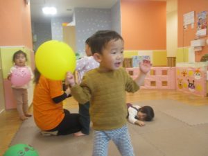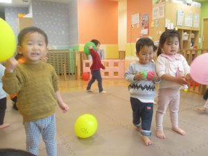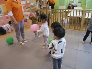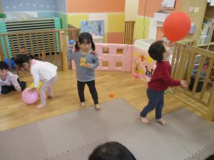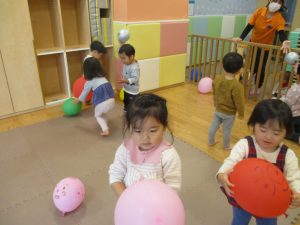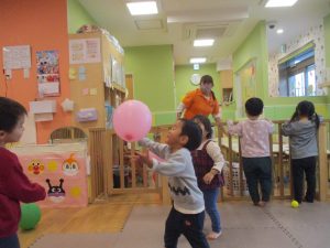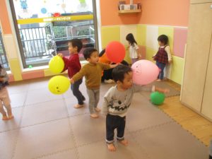 雨もポツポツと降ってきた為、保育園に戻り風船やカラーボールを使ってたくさん体を動かしました。