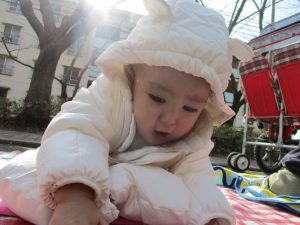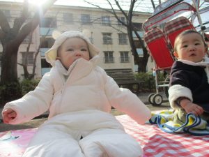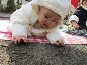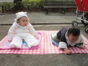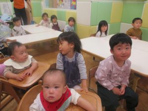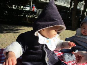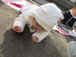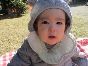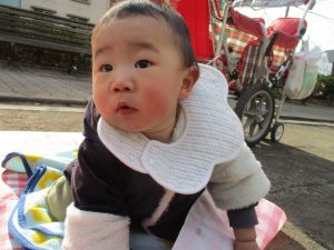 0歳児クラスのお友達もシートの上に座り、外気浴を楽しみました♪