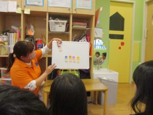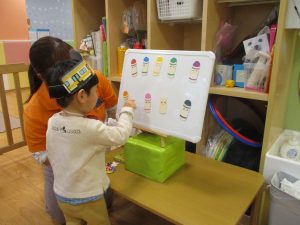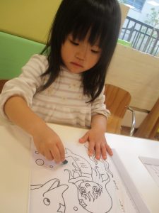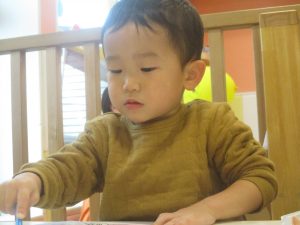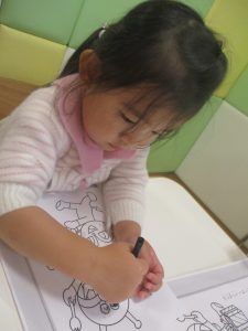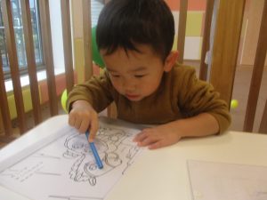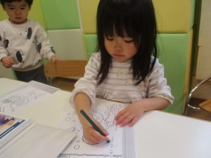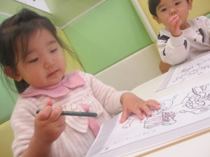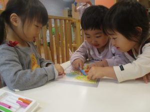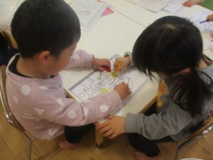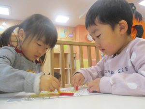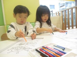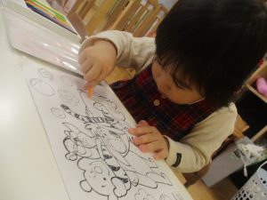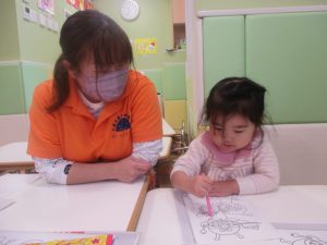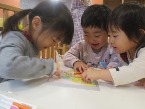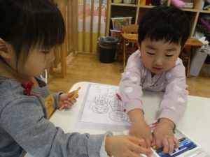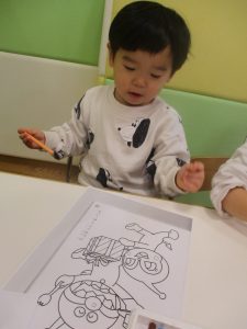 2歳児クラスでは塗り絵を通してお子様同士の関わり合いもあり、とても素晴らしいですね♪