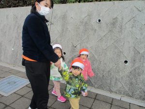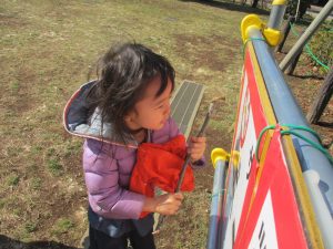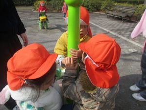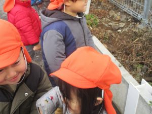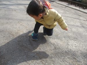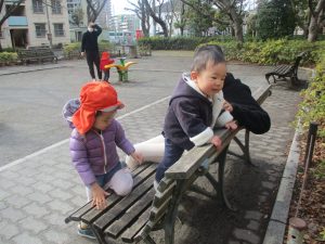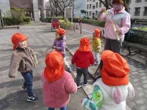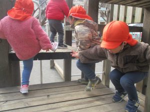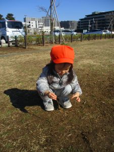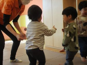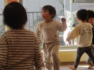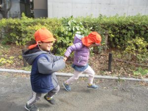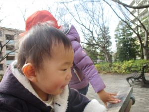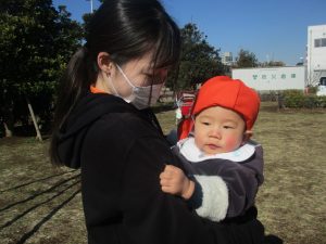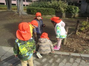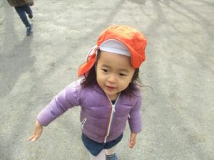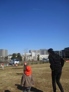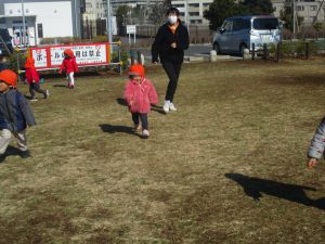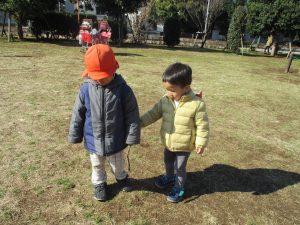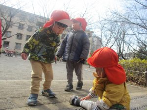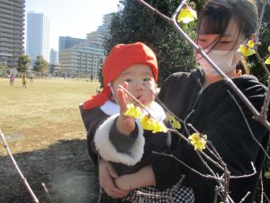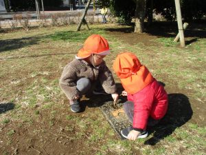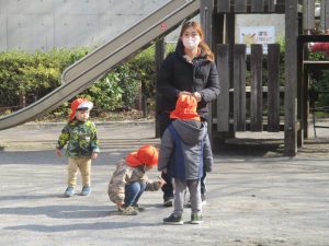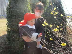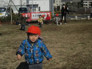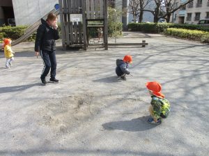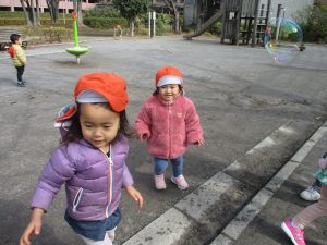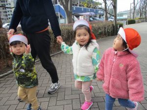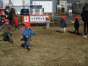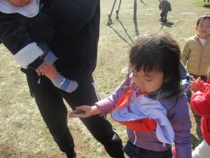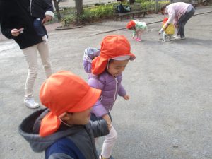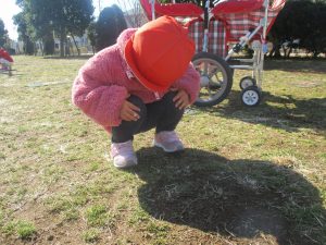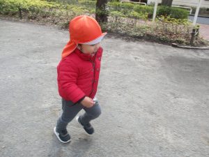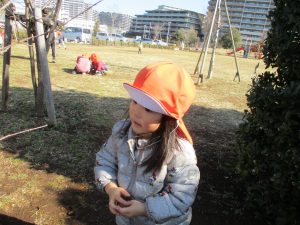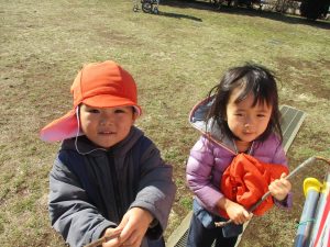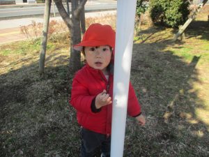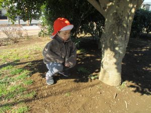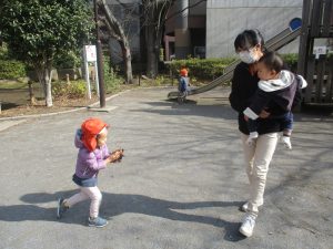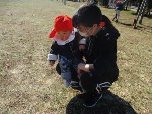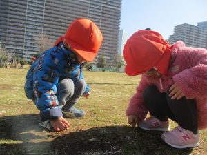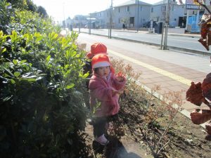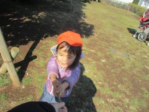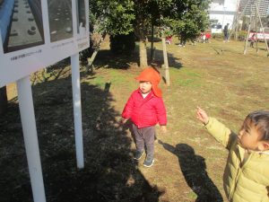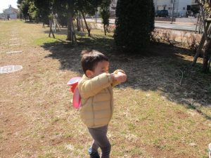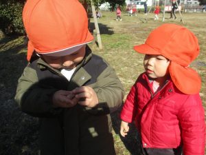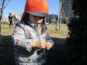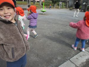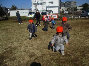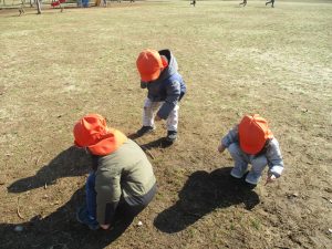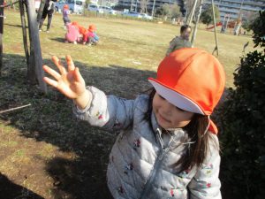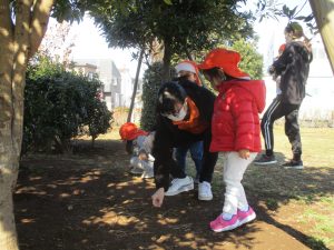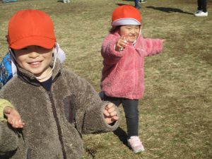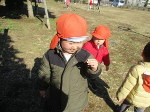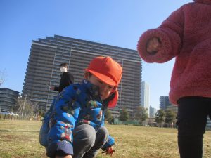 北風が身に沁みましたが予想以上に気温が上がり、快晴の中自然物探しや追いかけっこを通してたくさん体を動かして遊びました。